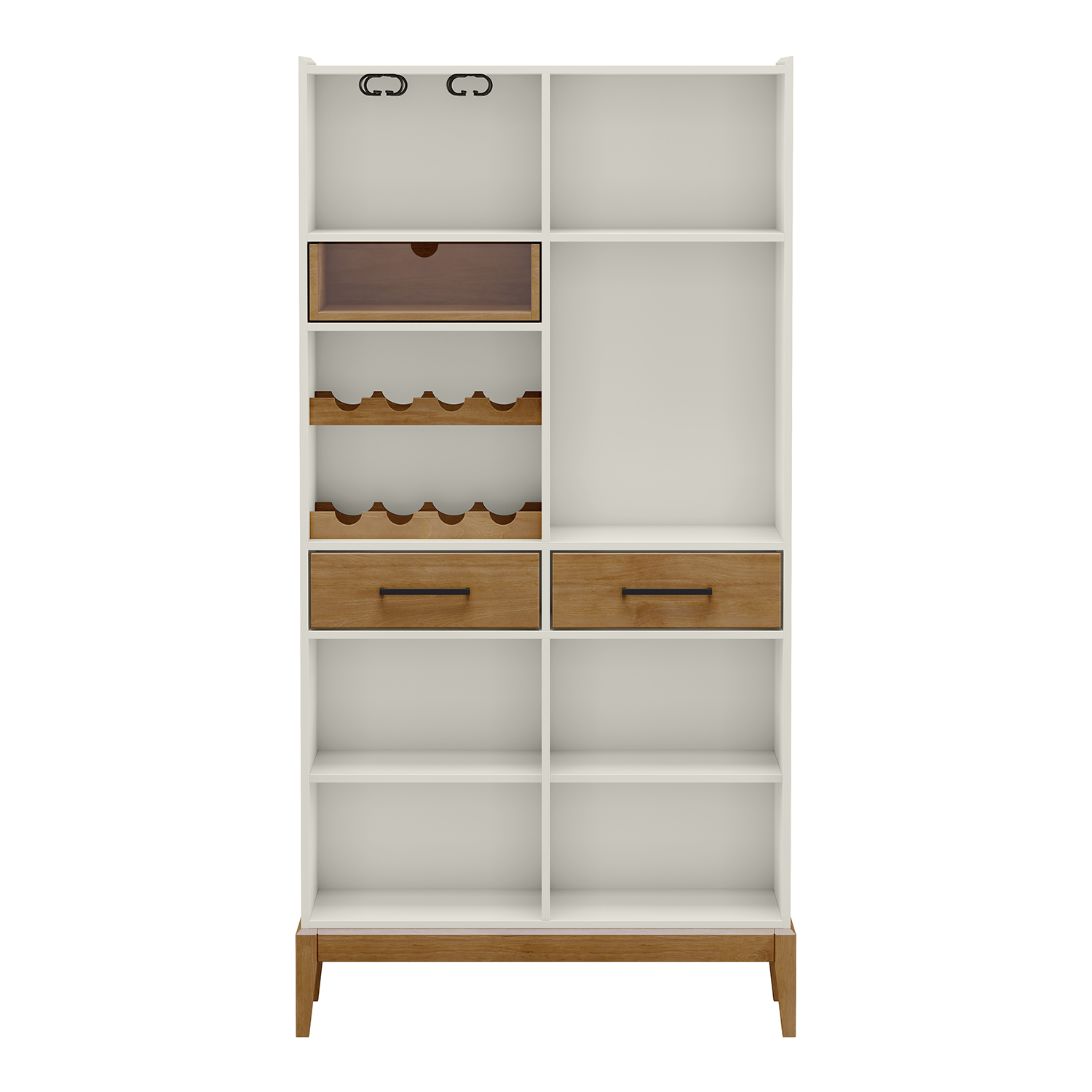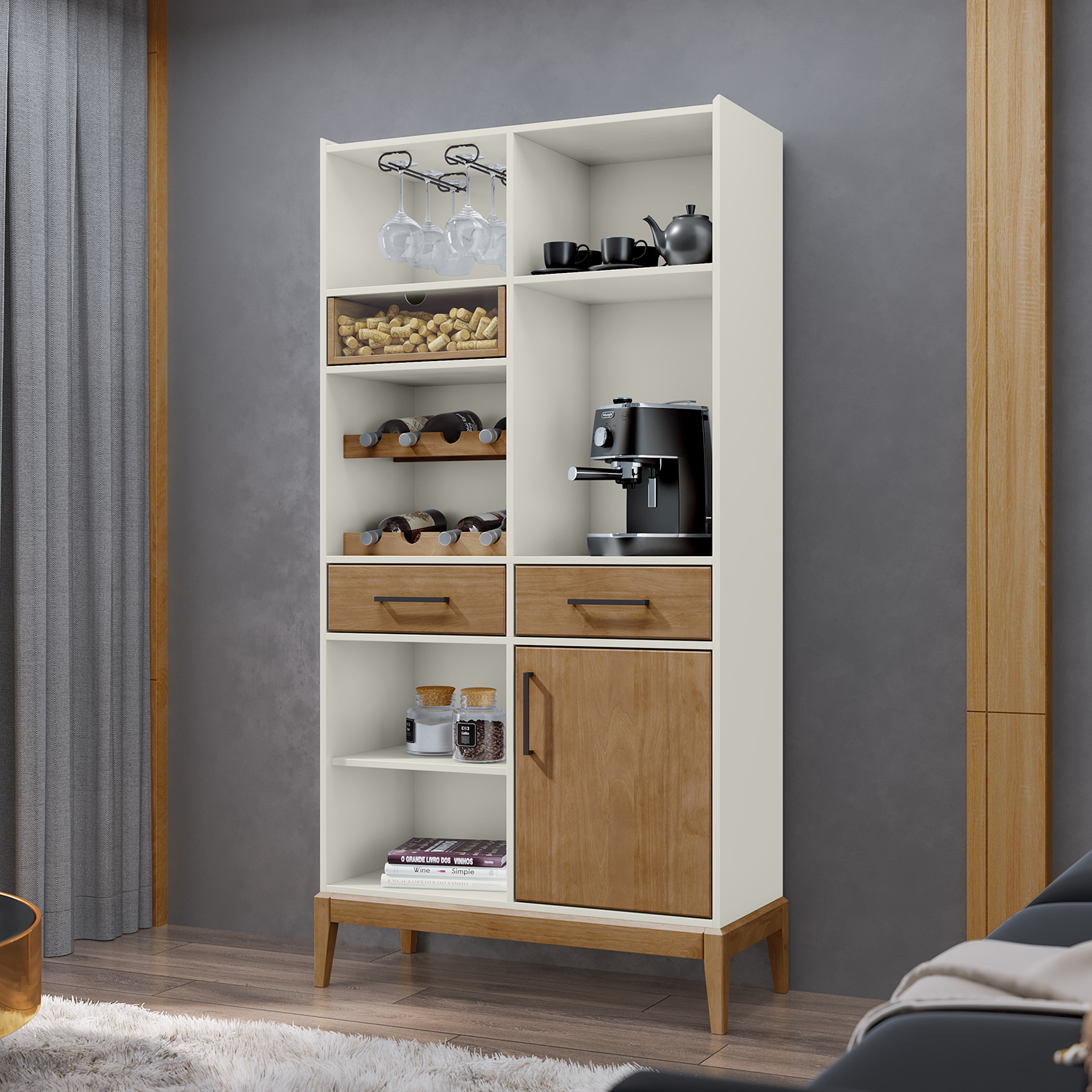 Objavte eleganciu a praktickosť s našou barovou skriňou, ktorá kombinuje masív borovice s kvalitným MDF materiálom v elegantnom dubovom a bielom prevedení. Táto barová skriňa je stvorená pre milovníkov vína a štýlového bývania. Čierne kovové úchytky dodávajú skrini moderný a sofistikovaný vzhľad. Skriňa disponuje jednými dvierkami a dvoma zásuvkami s kovovými pojazdmi, ktoré zaisťujú hladký a tichý chod. Vnútri nájdete dve špeciálne police na uloženie vína, čo poskytuje ideálne podmienky pre vaše najlepšie fľaše. Dva kovové držiaky umožňujú bezpečné uchytenie pohárov na víno, aby boli vždy po ruke a pripravené na použitie. Presklená zásuvka pridáva nádych luxusu a umožňuje elegantné vystavenie vašich cenností. Dve ďalšie police ponúkajú dostatok priestoru pre ďalšie barové potreby alebo dekorácie. Táto barová skriňa je nielen funkčným úložným priestorom, ale aj štýlovým doplnkom, ktorý prinesie do vášho domova nádych elegancie a pohostinnosti.