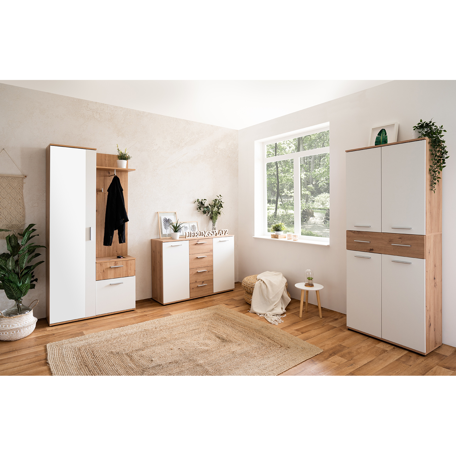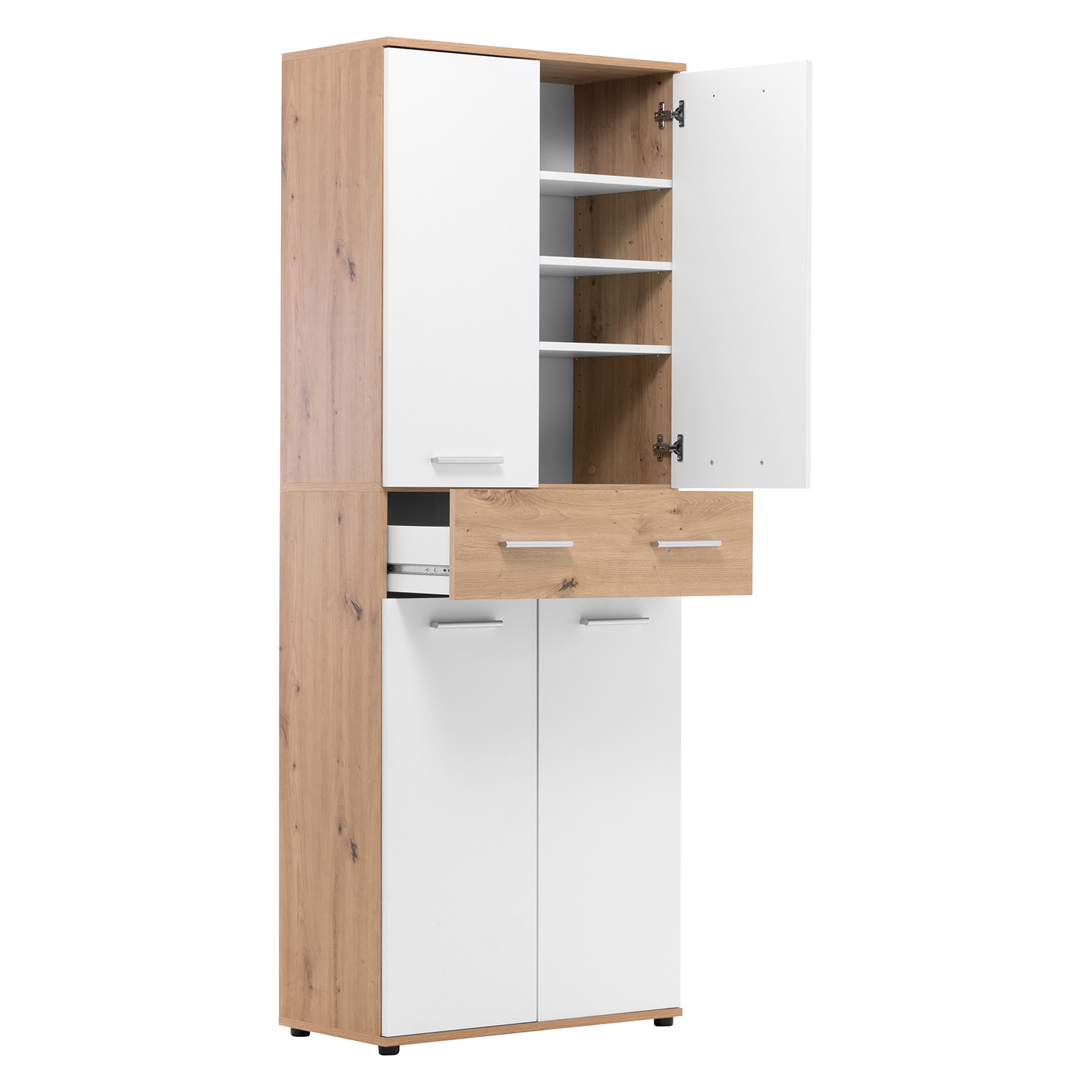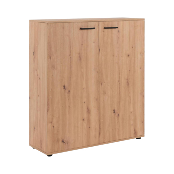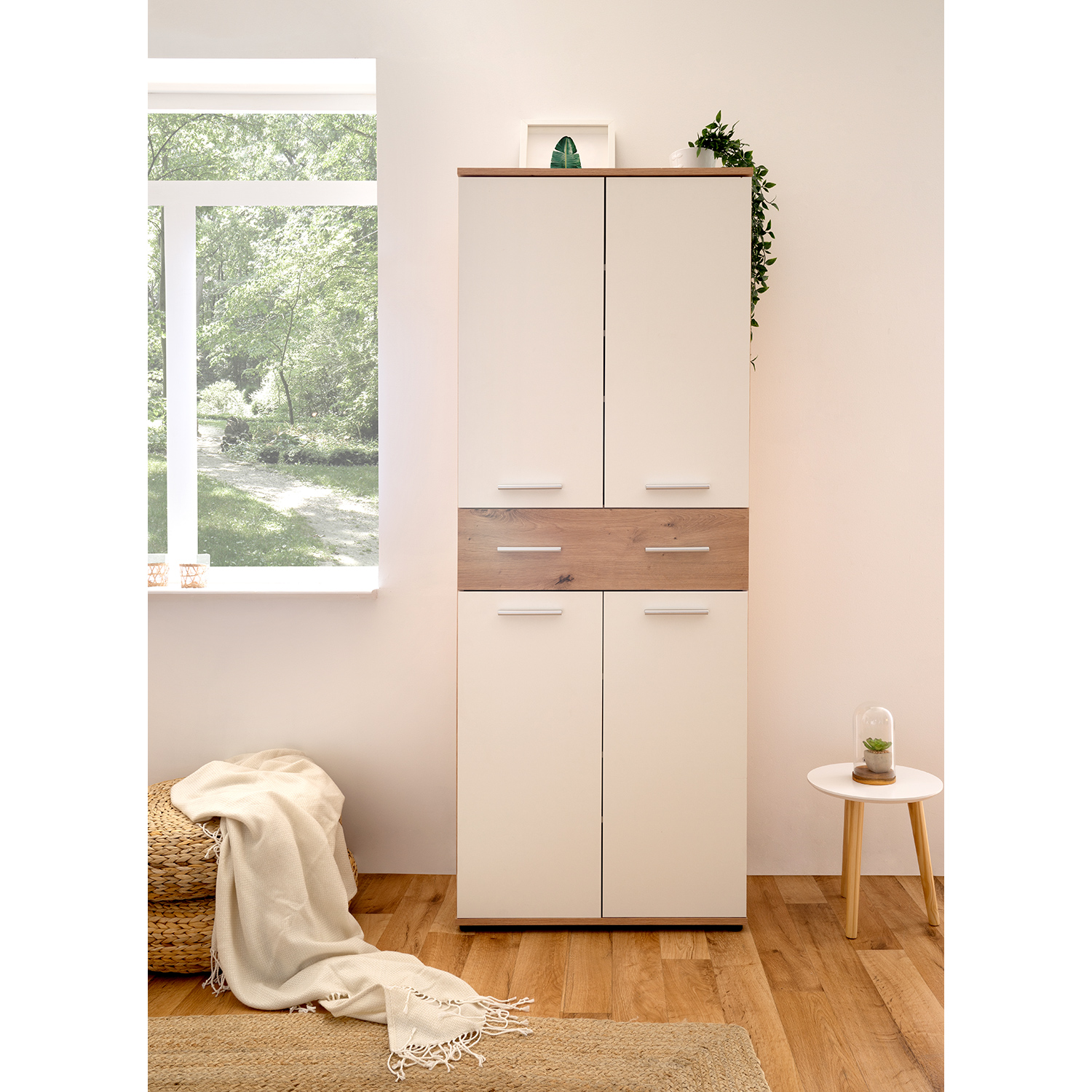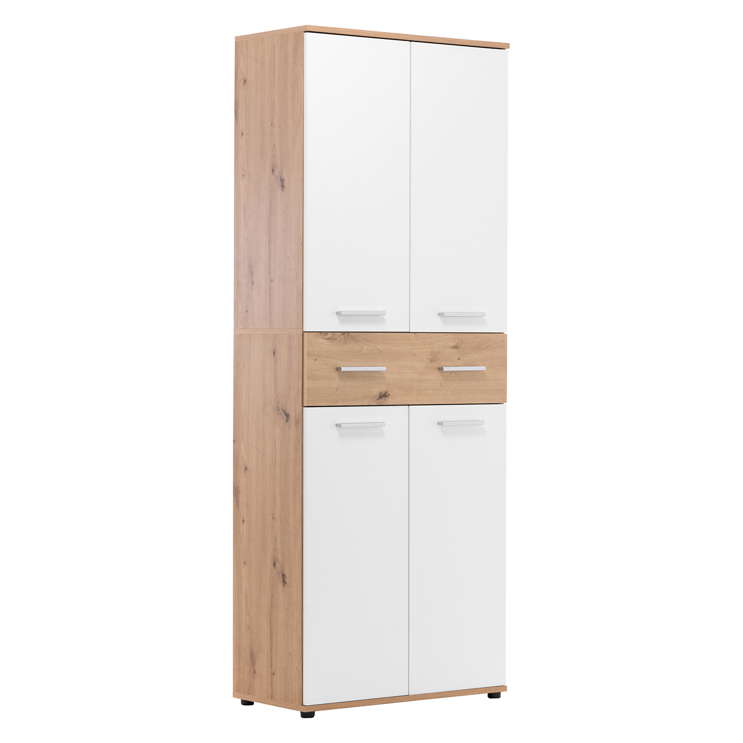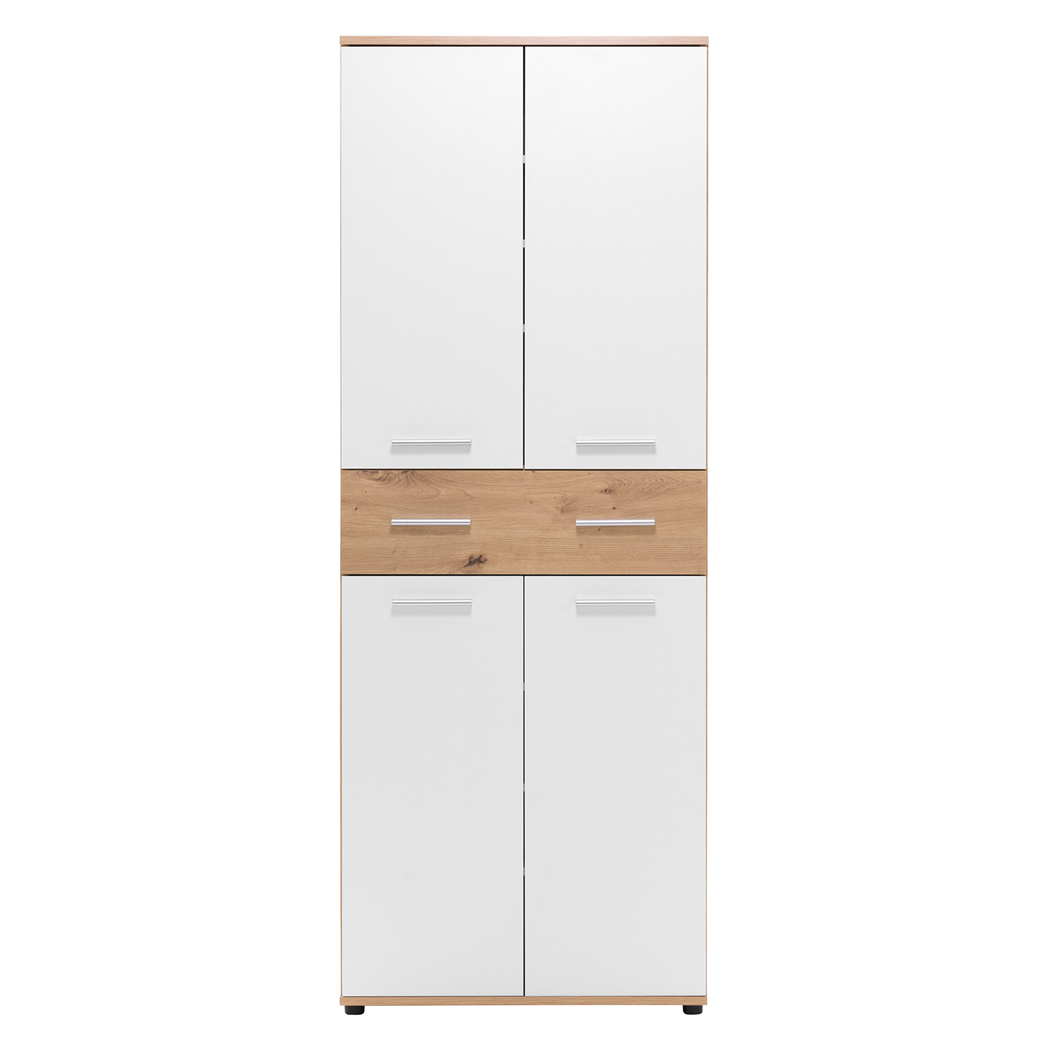 Či už máte slabosť pre pohodlné tenisky alebo dávate prednosť vysokým lodičkám, na vaše poklady je potrebný dostatočný priestor. Aj zbierka topánok musí byť uložená so cťou rovnako ako cenné artefakty v múzeu. Botník JACKY 42 vo farebnom prevedení biela / zlatý dub po otvorení dverí odkryje všetky vaše obľúbené kúsky. Do botníku sa zmestí naozaj veľké množstvo topánok. Priestranný botník má v hornej časti tri variabilné police, v dolnej má tiež tri variabilné police, takže uložíte ako nízke šľapky, tak vysoké čižmy. Uprostred botníku sa nachádza široká polica na doplnky či prezuvky. Topánky zostanú pekne vyrovnané v policiach k obdivu aj rýchlemu výberu. Akonáhle otvoríte vrchné alebo spodné dvere botníku, ihneď vidíte vaše zrovnané topánky. Predsieň vybavená vysokým botníkom bude pôsobiť úplne dokonale, nielenže botník uloží veľké množstvo obuvi, ale je možné ho jednoducho kombinovať aj so skriňou JACKY 40 v totožnom farebnom prevedení. Do vysokého botníku JACKY 42 uložíte obuv celej vašej rodiny.