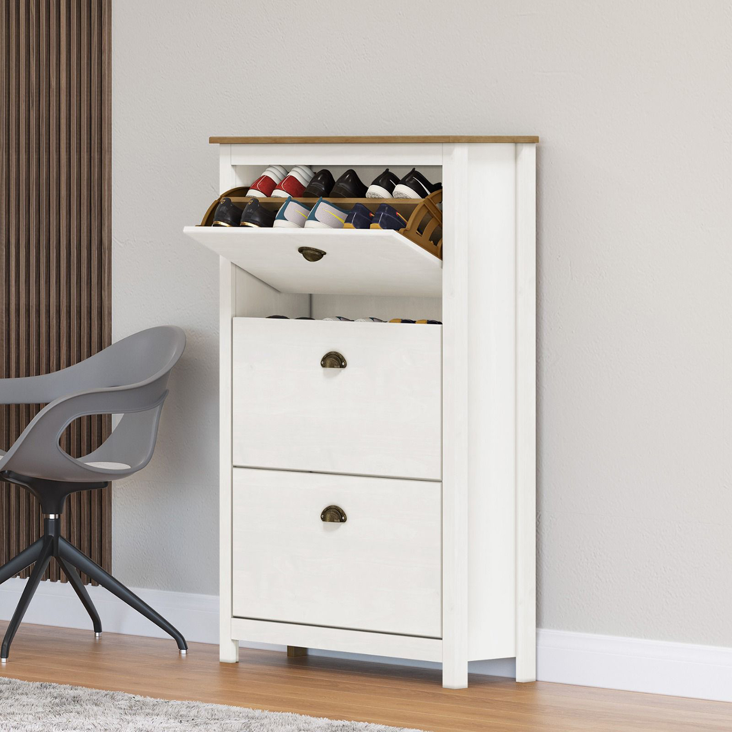 Nábytok do predsiene by mal byť predovšetkým praktický, avšak ani jeho vzhľad by nemal byť nedôležitý. Základným kúskom nábytku do vašej predsiene musí byť šikovne riešený a predovšetkým priestranný botník. Botník TOPAZIO v prevedení masív borovica, vo farebnom prevedení biely / hnedý lak, uspokojí vaše predstavy o funkčnom a elegantnom kúsku, ktorý ozdobí vašu predsieň. Biely botník s tromi dvojradovými výklopmi s kovovými úchytkami pojme veľa párov topánok. Úzky botník s výklopmi je jednoducho veľmi podareným riešením ako vybaviť vašu predsieň. Všetky obľúbené kúsky obuvi totiž budete mať pekne pohromade a prvá miestnosť vo vašej domácnosti bude pôsobiť skutočne príjemne. Zariaďte si predsieň bielym masívnym nábytkom TOPAZIO.