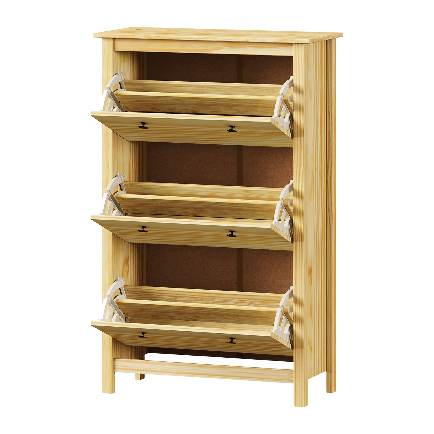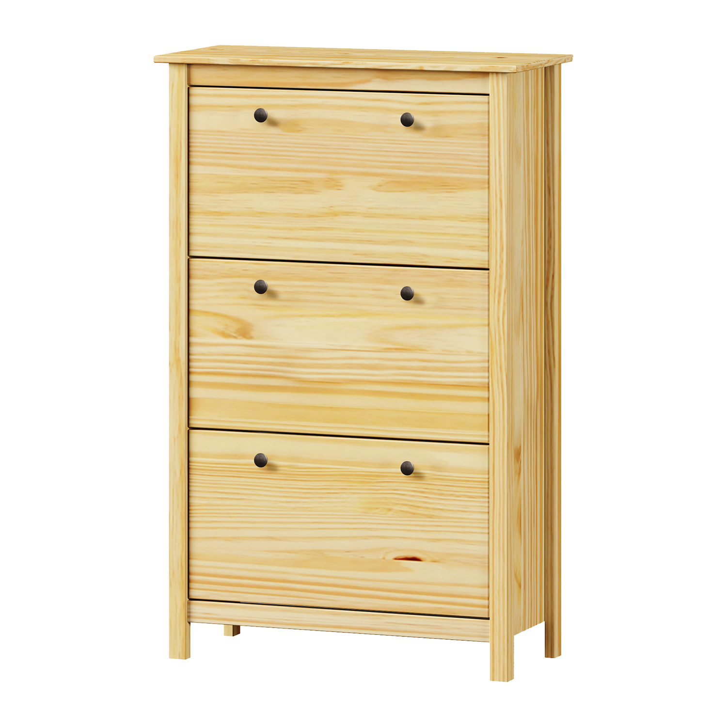 Botník TORINO je riešenie, ktoré sa na nič nehrá a pritom presne vie, čo robí. Je to nábytok, ktorý prináša poriadok tam, kde často vládne chaos. Miesto predsiene preplnené topánkami ponúkne prehľadný a praktický priestor. Jeho konštrukcia z masívu borovicového dreva pôsobí pevne a poctivo. Každý detail je spracovaný s citom pre jednoduchosť a funkčnosť. Prírodný vzhľad borovice v kombinácii s kovovými úchytkami vytvára dojem príjemného vidieckeho štýlu, ktorý sa ale skvele hodí aj do mestského bytu. Povrchová úprava necháva vyniknúť kresbe dreva a zároveň chráni materiál pred každodenným opotrebovaním. Botník má tri dvojradové výklopy, kam bez problémov uložíte obuv celej rodiny. Hornú dosku môžete využiť ako odkladaciu plochu na tašky, kľúče alebo dekorácie. Vďaka kompaktným rozmerom nezaberie veľa miesta, ale pritom uschová viac, než to na prvý pohľad vyzerá. Tento kus nábytku je ideálnou voľbou pre tých, ktorí majú radi poriadok, ale nechcú studený katalógový vzhľad. TORINO prináša do predsiene teplo, štruktúru a praktické využitie v jednom.