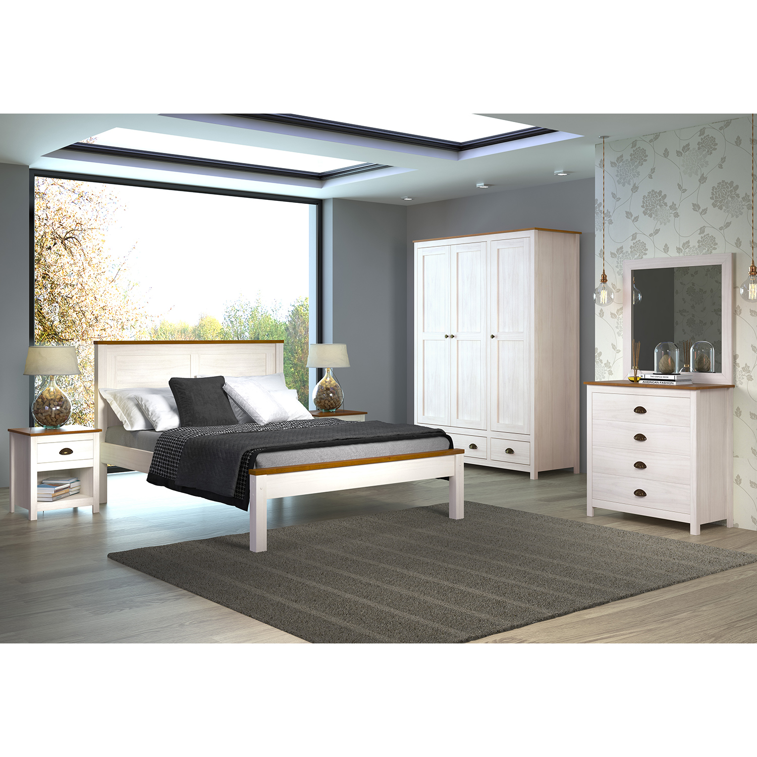 Kód produktu: 206263materiál masív borovica, farebné prevedenie biely / hnedý lak tri zásuvky s kovovými úchytkami a pojazdmi v ľavej a pravej časti 1 polica a kovová šatníková tyč, v strednej časti 3 police, na dvoch stredných dverách je zrkadlo nadstavec je súčasťou dodávky