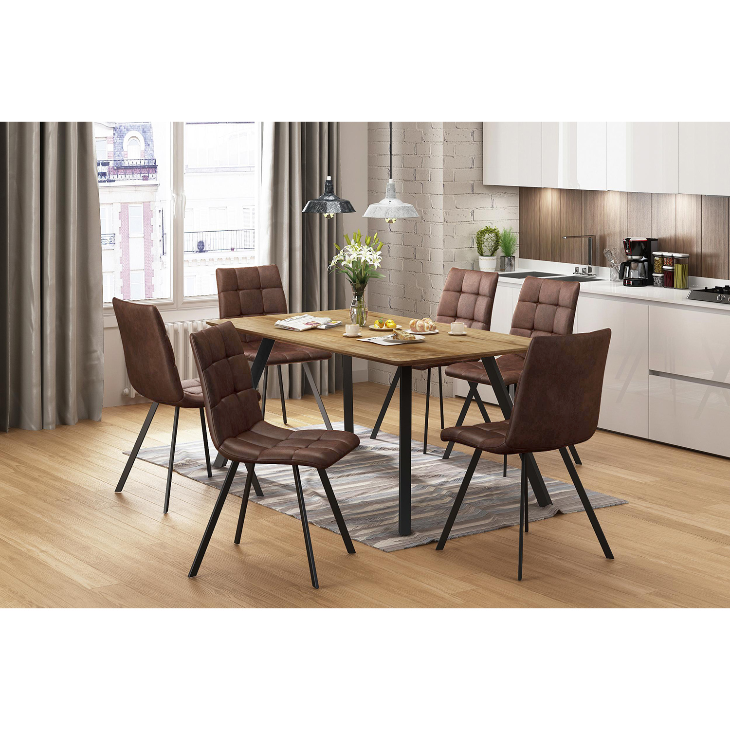 jedálenský stôl BERGEN 4090 a 4 jedálenské stoličky BERGEN 4093 stôl: doska MDF, farebné prevedenie dub Wotan kovová konštrukcia, farebné prevedenie čierna stolička: poťah brúsená koža – imitácia mikrovlákno, farebné prevedenie hnedá kovová konštrukcia, farebné prevedenie čierna výška sedu stoličky 51 cm rozmer stola (š/h/v) 140 × 80 × 75 cm rozmer stoličky (š/h/v) 45 × 52 × 88 cm