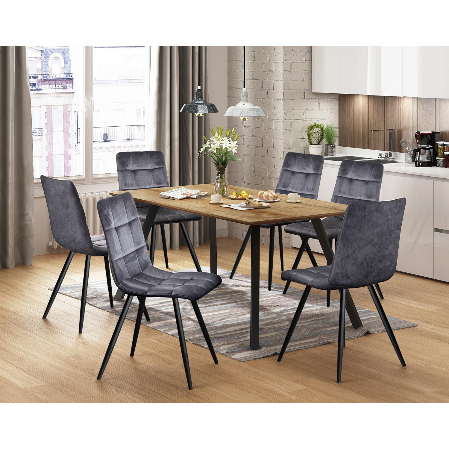 Keď prídete domov unavení z práce, chcete, aby vás v jedálni privítalo nielen teplé a chutné jedlo, ale aj krásny a príjemný jedálenský set. Jedálenský stôl BERGEN + 6 stoličiek BERGREN vám zaručia maximálne pohodlie. Veľká stolová doska je ideálna na prestieranie rôznych pochúťok a šesť stoličiek bude stačiť na usadenie aj väčších hostí. Jedáleň sa tak stane nielen miestom stolovania, ale aj miestom rôznych osláv. Stoličky s pevnou kovovou konštrukciou a hladkým zamatovým poťahom v sivej farbe dokonale ladia so stolom s kovovou konštrukciou. Výberom vopred zmontovanej jedálenskej súpravy nikdy neurobíte chybu. Pretože miestnosť, v ktorej prijímate hostí, by mala vždy pôsobiť prívetivo už na prvý pohľad. Zariaďte tento priestor jedálenským setom BERGEN so stolom a stoličkami a vytvorte jedinečnú atmosféru a luxusne zariadenú miestnosť.