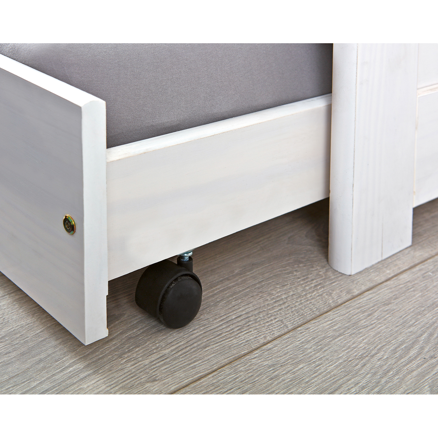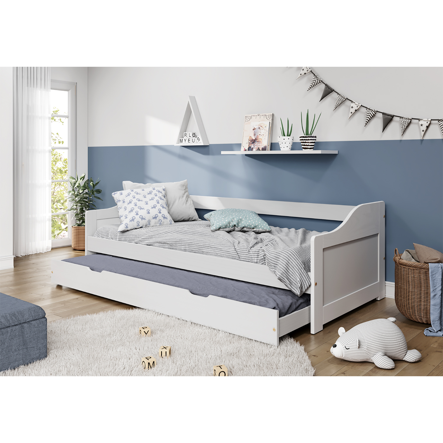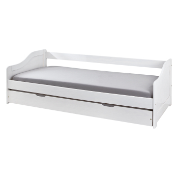 Nábytok do detskej izby musí byť na rozdiel od toho pre dospelých zaujímavý a hravý, taký, ktorý deti ihneď zaujme. Jednolôžko s prístelkou LAURA v bielej farbe sa bude deťom páčiť. Je veľmi priestranné a v prípade potreby vaše deti vo svojom kráľovstve ubytujú cez noc kamaráta. Jednolôžko totiž disponuje úložným priestorom, ktorý je možné využiť ako šikovnú prístelku, stačí iba pridať matrac. Pevné a kvalitné lôžko bude vyhovovať aj náročným rodičom. Toto lôžko vašim deťom vydrží až do dospelosti, je vyrobené z masívu borovice. Jednolôžko s prístelkou LAURA je tiež skvelou voľbou do izieb pre hostí aj do malých bytov či garsónok. Táto posteľ sa však bude hodiť aj do študentských izieb a spální jednočlenných domácností. Prístelku je možné využiť aj na uloženie periny, vankúša a posteľnej bielizne, lôžko potom bude slúžiť namiesto pohovky. Keď bočnicu zaobstaráte čalúneným valcom, vytvoríte si úplne luxusné posedenie. Jednolôžko s prístelkou LAURA je jednoducho kúskom nábytku, ktorý sa oplatí mať doma.
