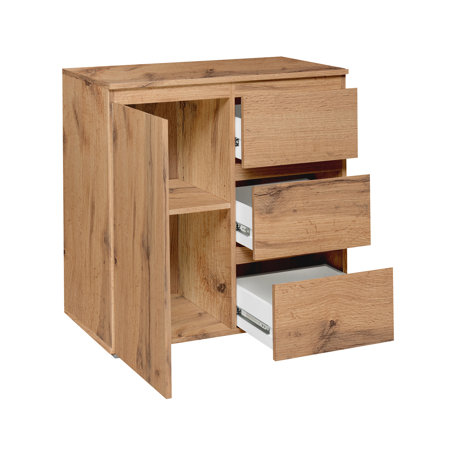 1 dvere, 1 polica, 3 zásuvky s kovovými pojazdmi