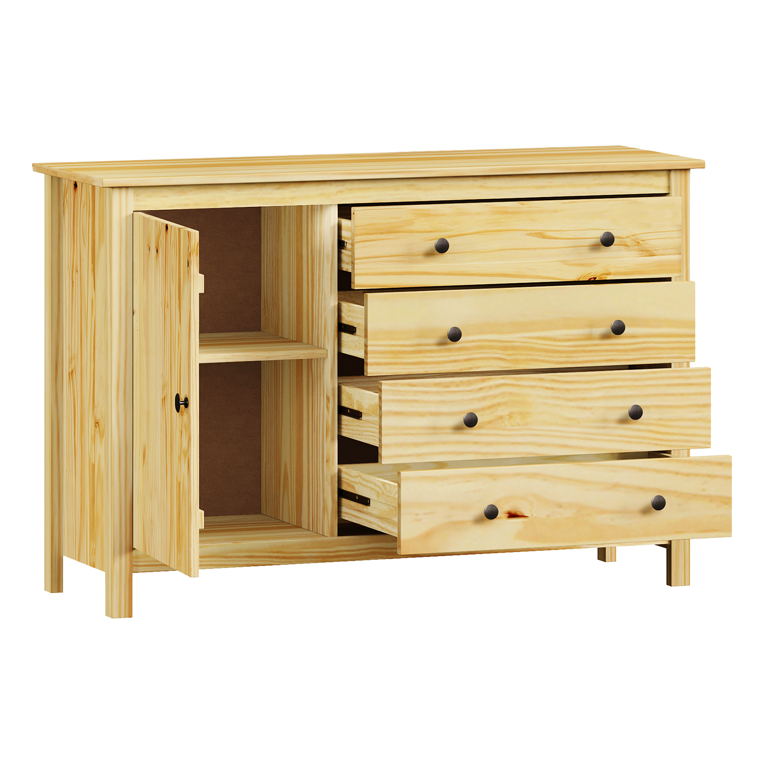 Kód produktu: 68062Kmateriál masív borovica, lakované prevedenie kovové úchytky vo farebnom prevedení černená mosadz 4 zásuvky s kovovými pojazdmi, 2 plné dvere, 1 polica