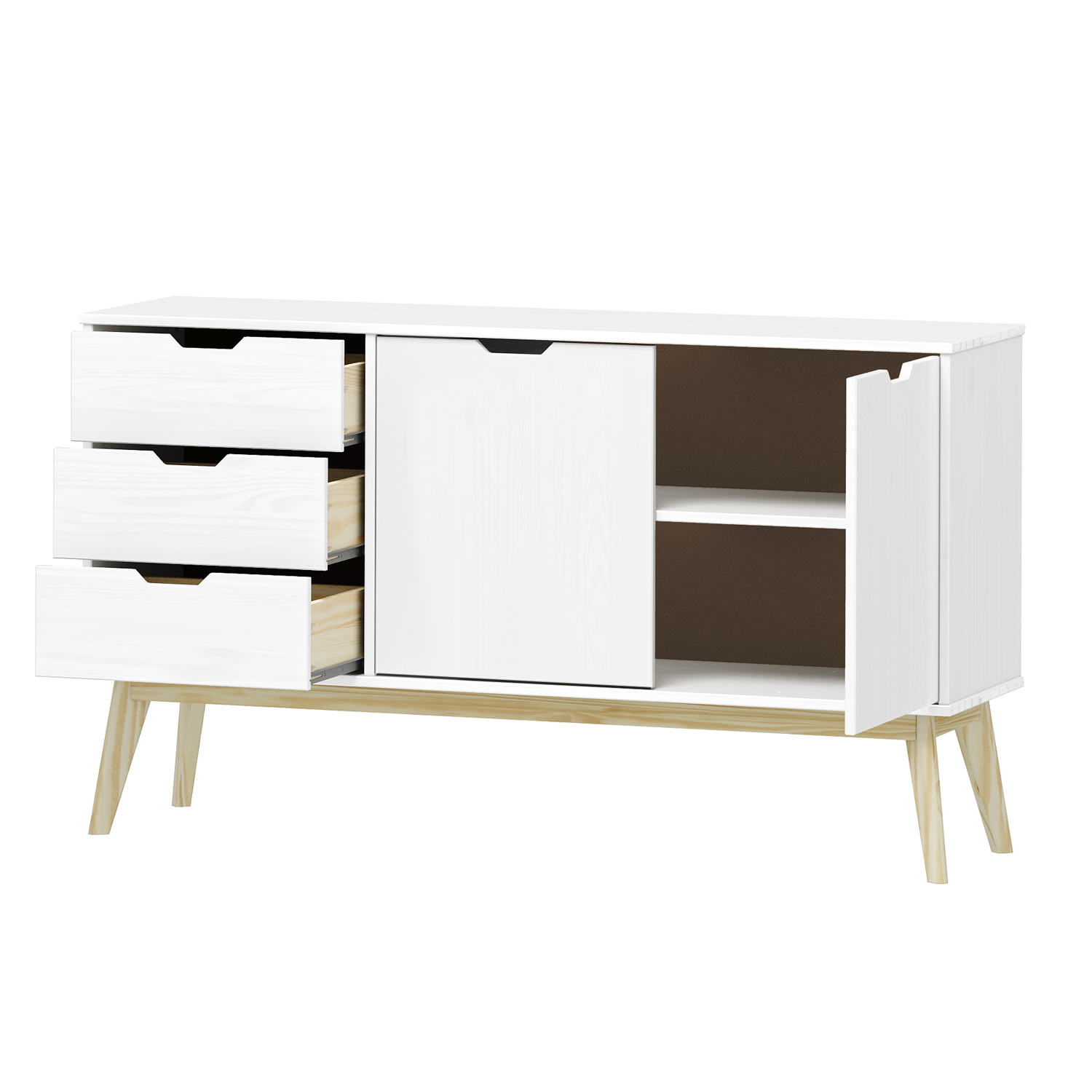 Komody dnes majú svoje miesto snáď v každom priestore, krásne do nich uložíte potrebné veci a vašej izbe dajú originálny vzhľad, a to nielen vďaka ich rôznorodému prevedeniu. Na komodu je možné vystaviť všetko, čo máte radi a dať tak izbe domáckú atmosféru. Plocha komody sa tak môže stať jedinečnou výstavou dekorácií a fotiek. Komoda BONITO vo farebnom prevedení biely lak vás bude tešiť v obývacej izbe, spálni, jedálni aj pracovne, jej elegantný vzhľad a praktické usporiadanie si obľúbia všetky gazdinky aj pracujúce ženy. Elegantná komoda obsahuje šikovne oddelené priestory, skladá sa z dvoch úzkych priestorov s dvierkami a jednou policou. Vľavo sa nachádzajú 3 zásuvky s kovovými pojazdmi. V kancelárii na dokumenty, v jedálni na jedálenský servis, v obývacej izbe na knihy a v spálni na oblečenie, táto komoda sa vám skrátka nestratí.