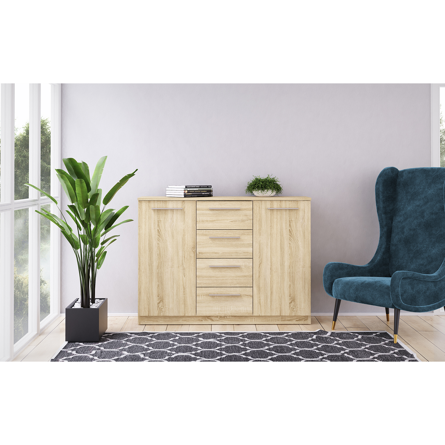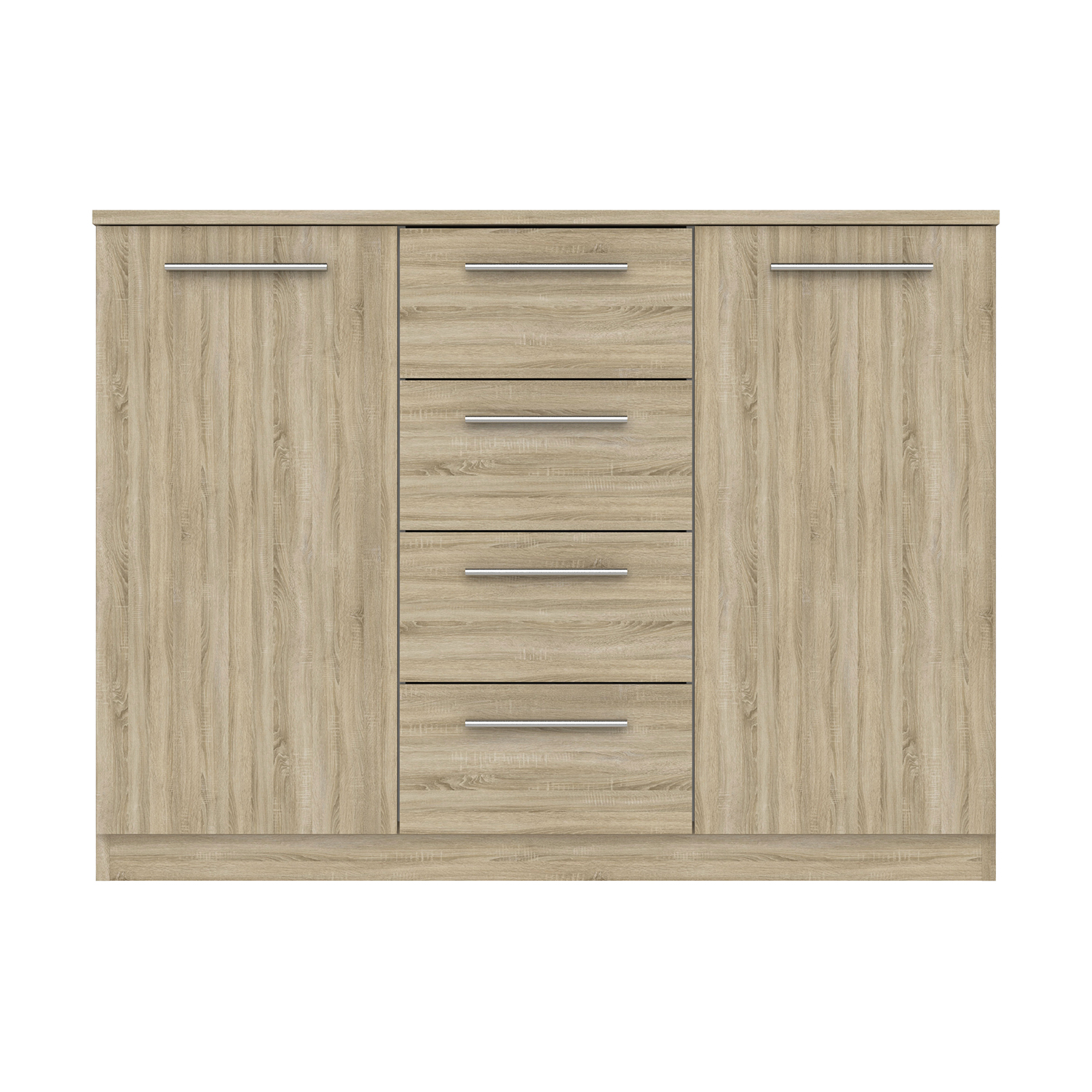 Vďaka komode docielite perfektný rád a poriadok. Na porovnanie vašich zvrškov vám nemusí slúžiť iba šatníkové skrine, ale aj komoda vám v tomto môže vyjsť v ústrety. Svoje tričká dokonale poskladáte do komínov a jednoducho uložíte do zásuviek. Komoda SURREY IN5002648D je vybavená 2 dvierkami a 4 zásuvkami s kovovými pojazdmi. Farebné prevedenie je dub Sonoma preto túto komodu odporúčame kombinovať s ostatnými kusmi nábytku z tejto farebnej série. Vrchnú časť komody môžete ozdobiť kvetinami, dekoráciami, alebo fotografiami s vašimi najbližšími. Komoda však nemusí slúžiť iba na uloženie oblečenia. Využitie môžete nájsť aj vo vašej pracovni na uloženie dôležitých dokumentov. Doprajte si krásne upratanú domácnosť vďaka komode SURREY.