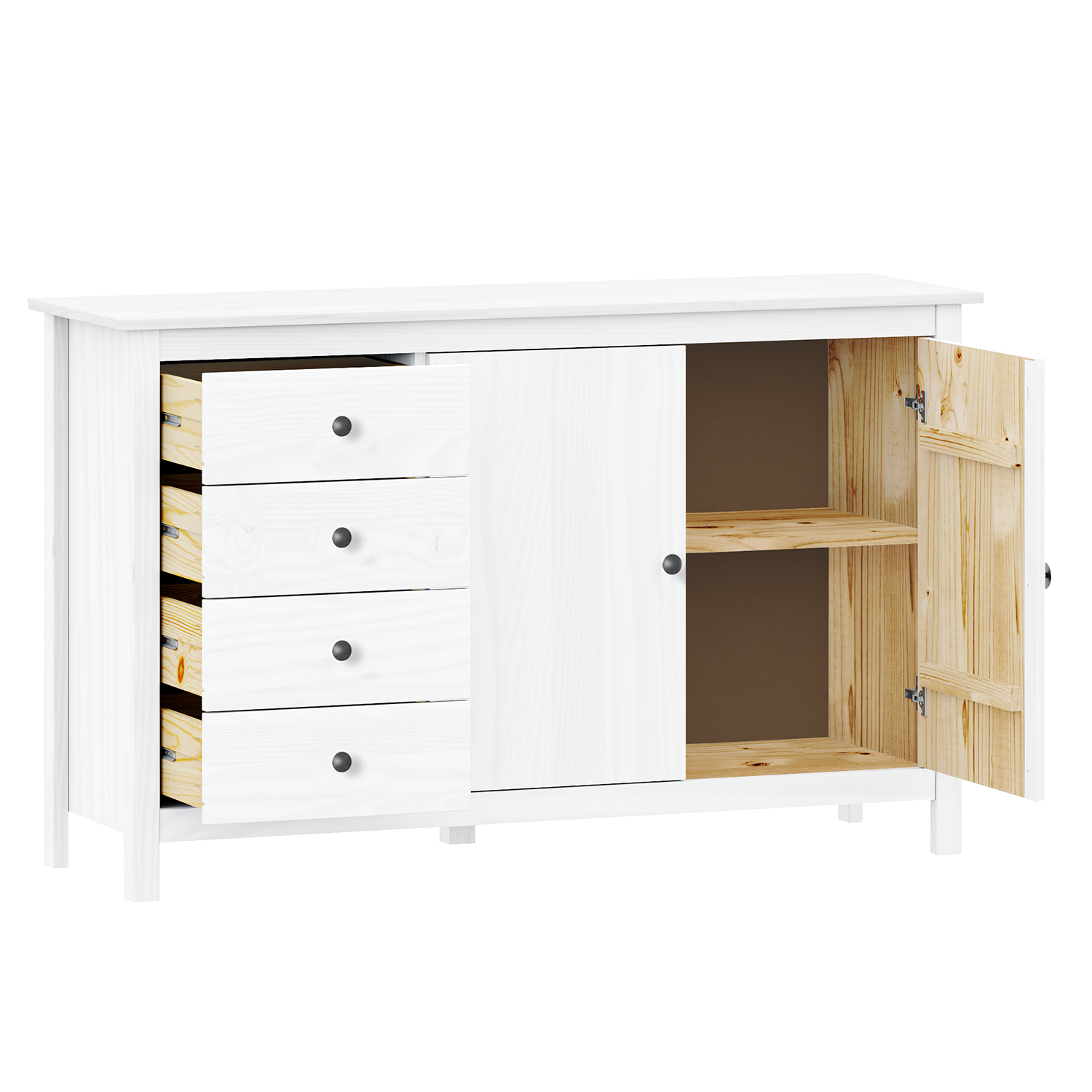 4 zásuvky s kovovými pojazdmi, 2 plné dvere, 1 polica
