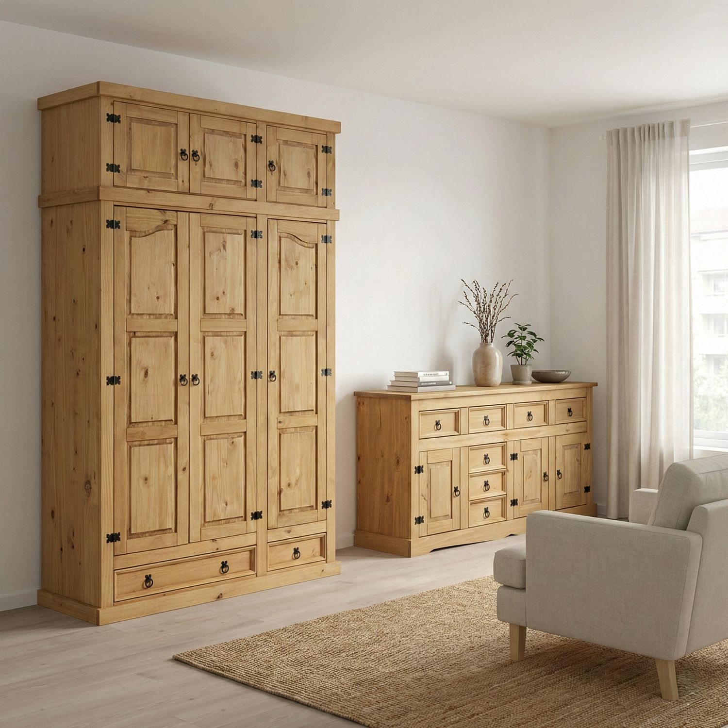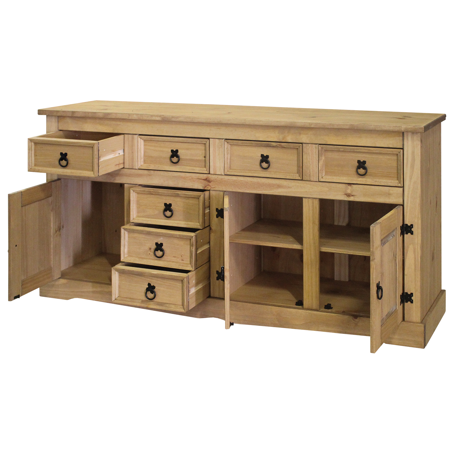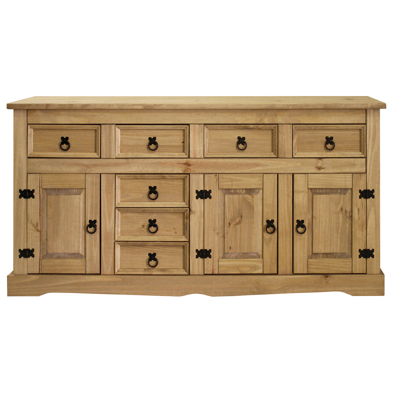 Obrovská masívna komoda v rustikálnom štýle urobí s priestorom obývacej izby hotové divy. Komoda 3 dvere + 7 zásuviek CORONA v prevedení masív borovica je voskovaná v dokonalom medovom odtieni, takže bude lahodiť vášmu oku. Členitá komoda má sedem zásuviek a dva úložné priestory vybavené dvierkami, väčší úložný priestor s dvoma dvierkami obsahuje policu. Veľkú komodu tak najlepšie využijete práve v obývacej izbe a v pracovni na uloženie dokumentov, drobných vecí a kníh. Komoda však môže poslúžiť aj v spálni ako bielizník, v jedálni potom ako šikovný príborník. Je teda len na vás, kde túto krásnu a zároveň praktickú komodu budete potrebovať. Komoda zapadne najlepšie do priestorov zariadených práve nábytkom zo zostavy CORONA, ktorej je súčasťou. Rustikálna komoda je naozaj jedinečným kúskom nábytku, a to ako vďaka originálnemu dizajnu a kovovému zdobeniu, tak vďaka členitému úložnému priestoru. Urobte jej dostatočný priestor a na jej plochu vystavte veci, ktoré máte radi, tento úžasný kúsok nábytku si skrátka zamilujete.