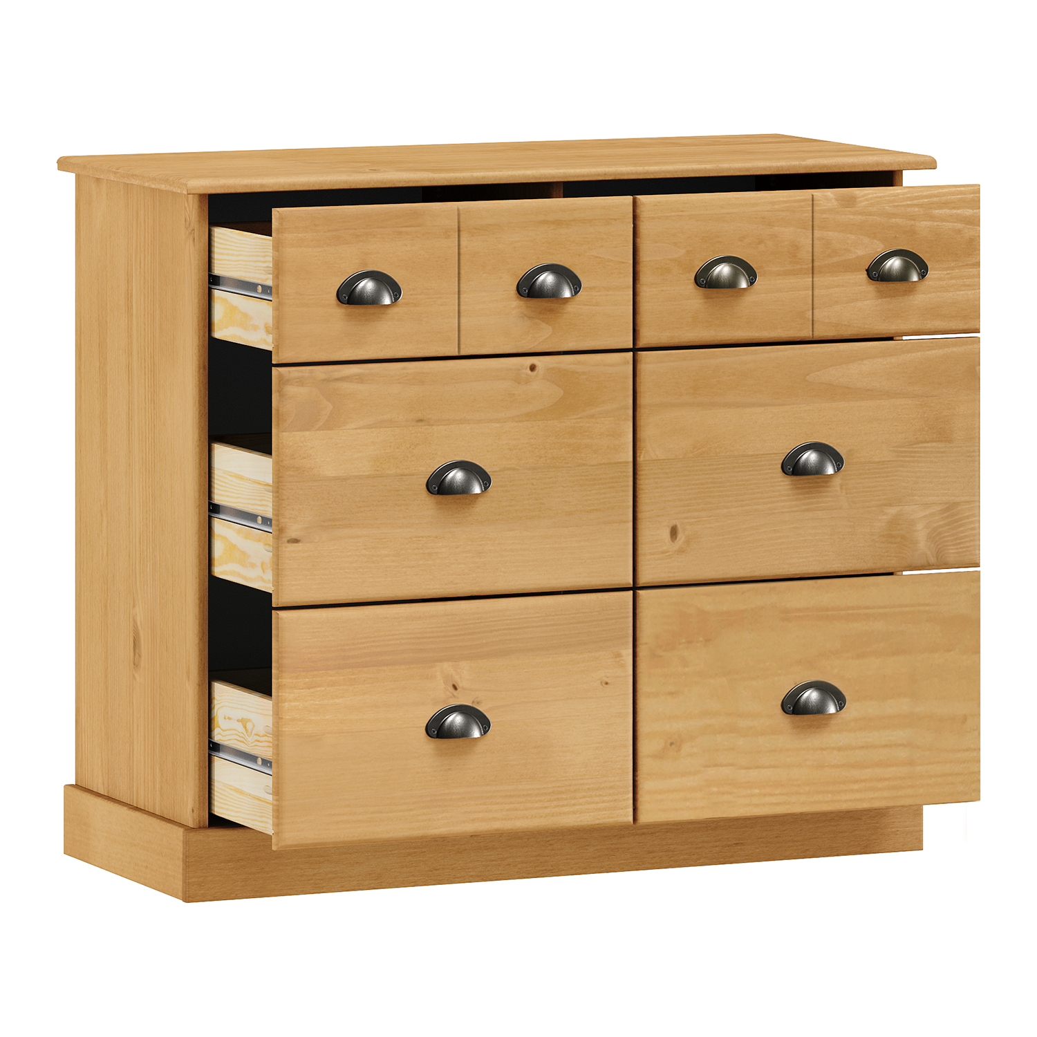 Komoda Stanford v prevedení s voskovaným povrchom v medovom odtieni je dokonalým spojením tradičného remesla a prirodzenej estetiky. Tento kúsok nábytku pôsobí príjemne teplo a domácky, pričom v interiéri vytvára útulnú atmosféru. Masívne borovicové drevo pod voskovanou úpravou dýcha prirodzenou krásou a každá kresba na povrchu je originál. Komoda ponúka štyri väčšie a dve menšie zásuvky, takže poskytne dostatok úložného priestoru na oblečenie, doplnky aj najrôznejšie nevyhnutnosti. Kovové úchytky dodávajú nábytku ľahký industriálny nádych a zároveň uľahčujú manipuláciu. Všetky zásuvky sú vybavené kovovými pojazdmi, vďaka ktorým sa vysúvajú hladko a bez námahy. Tento nábytok sa hodí do spálne, pracovne aj obývacej izby. Skvele zapadne ako do rustikálneho prostredia, tak aj do moderného interiéru, ktorému dodá kontrast a hrejivý akcent. Povrchová úprava voskom nielen zvýrazňuje štruktúru dreva, ale zároveň pomáha chrániť povrch pred každodenným opotrebovaním. Komoda Stanford je nadčasový a funkčný kus, ktorý ocení každý, kto má rád poctivý materiál a prirodzený vzhľad.