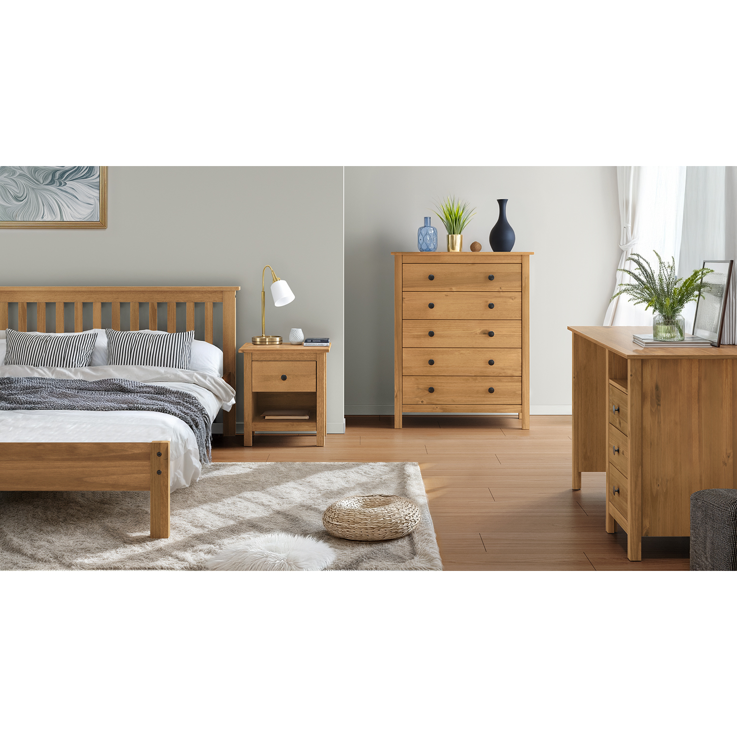 Komody stále patria medzi najobľúbenejšie kúsky nábytku. Ponúkajú množstvo úložného priestoru, ale zároveň nezaplní miestnosť a opticky tak priestor zostáva stále vzdušný. Vzdušnejší než izba s nábytkom siahajúcim k stropu. Komoda TORINO je z masívneho borovicového dreva voskovaného v medovom odtieni. Ponúka 5 zásuviek s kovovými úchytkami vo farebnom prevedení čiernená mosadz. Zásuvky sú opatrené kovovými pojazdmi na zaistenie ľahkého a tichého otvárania a zatvárania. Túto komodu je možné využiť ako doplňujúci úložný priestor k šatníkovej skrini. Na doplnky, spodnú alebo posteľnú bielizeň je úplne ideálna. Využiť ju samozrejme môžete aj v obývacej izbe alebo napríklad v predsieni. Komoda bude skvele vyzerať v kombinácii s nábytkom z rovnakej série TORINO vosk.