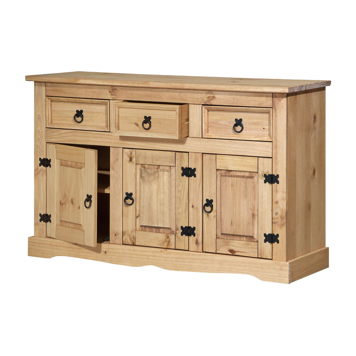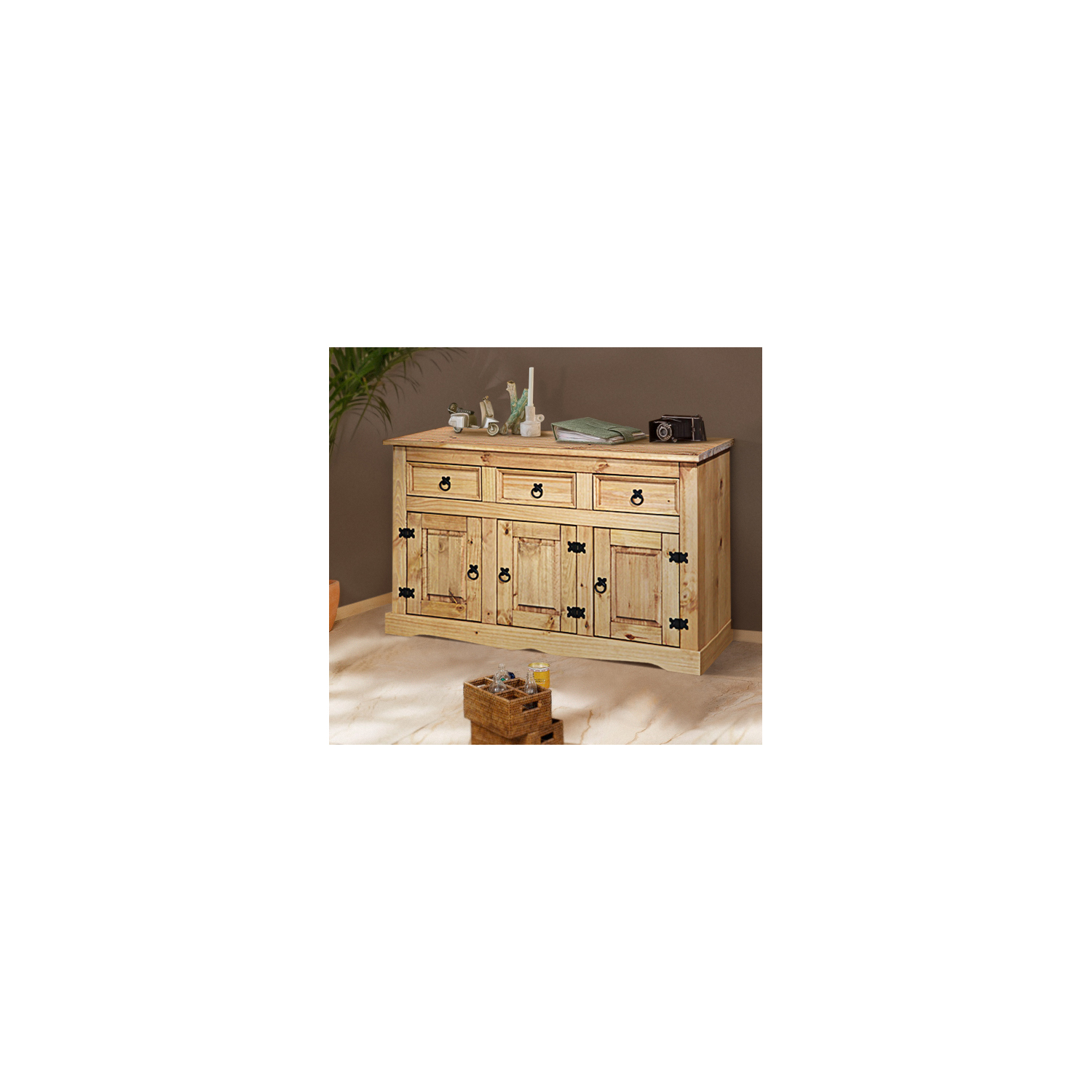 Zostava CORONA je kombináciou tradície a kvality, každá miestnosť vybavená nábytkom z tejto zostavy okamžite získa punc luxusu. Komoda CORONA 1639 v prevedení masív borovica voskovaná v krásnom medovom odtieni vás zaujme na prvý pohľad. Priestranná komoda sa hodí najmä do obývacej izby. V spojení s koženou pohovkou bude masívny nábytok vyzerať úplne dokonale, ale komoda bude vhodná aj do štýlovo zariadených pracovní. Komoda obsahuje tri malé zásuvky na menšie predmety a priestor za tromi dvierkami je vybavený jednou policou. Komodu CORONA zdobia krásne kovové úchytky a pánty v čiernej farbe, ktoré tomuto kusu nábytku dodávajú nezameniteľný vzhľad. Táto jedinečná komoda urobí veľa dobrého vo vašej jedálni ako praktický príborník. Zabývajte si tento luxusný kus nábytku u vás doma alebo využite jeho rustikálny vzhľad na chate či chalupe. Nábytok CORONA bude vyzerať skvele v modernom byte aj vo vidieckom dome, pretože kvalitný nábytok nikdy nevyjde z módy.