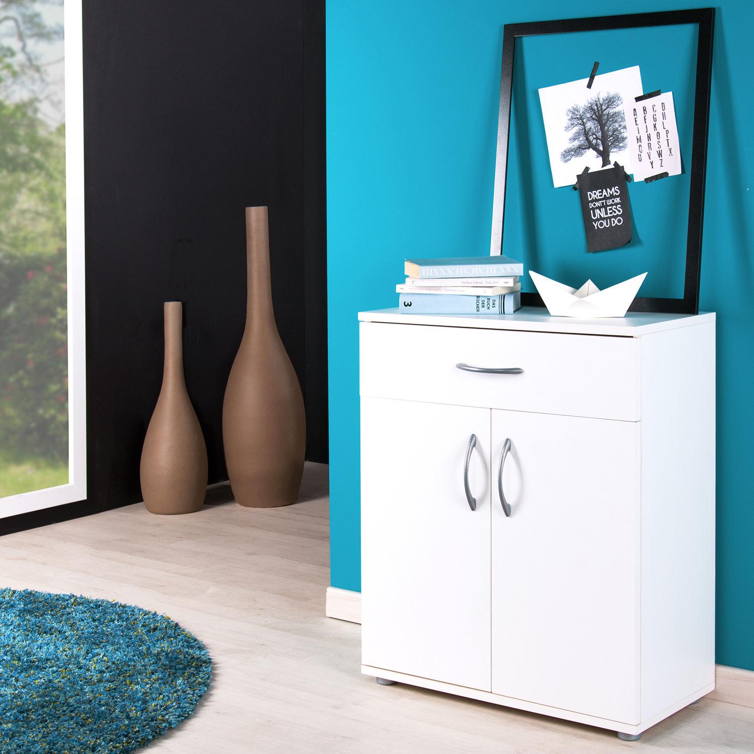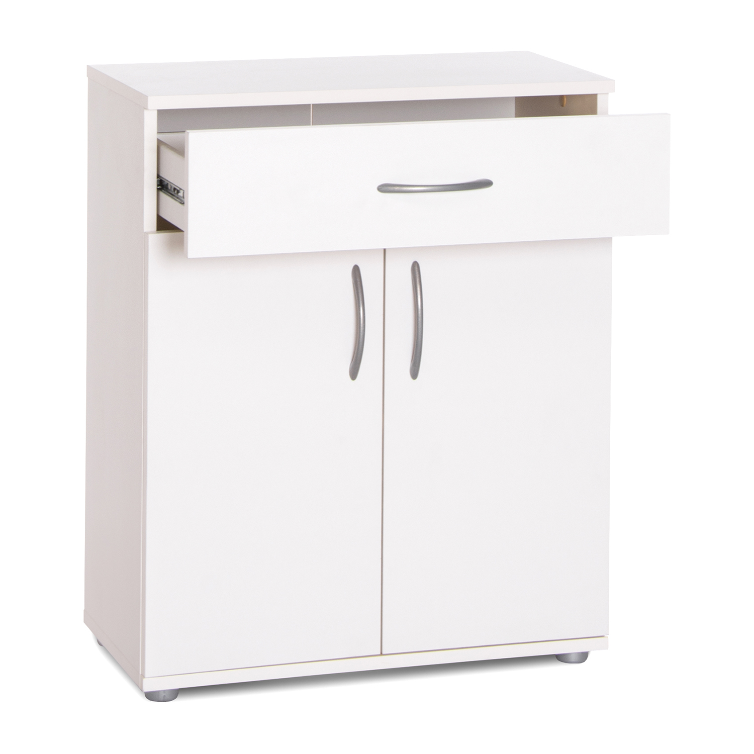 Aj malá komoda môže spôsobiť veľký neporiadok, preto nenechávajte veci ležať po byte, ale uložte ich do dobre umiestnených komôd. KomodavPEGGY 2 veľmi dobre poslúži na ukladanie dokumentov v kancelárii aj najrôznejších drobností v domácnosti. Komoda má jednu zásuvku s kovovými bežcami a 2 dvierka, za ktorými sa ukrýva 1 variabilná polica. Do bielej komody môžete uložiť rôzne veci, takže vám poslúži v spálni, v detskej izbe aj v predsieni či šatni. Môžete ju však použiť aj v blízkosti postele alebo pracovného stola v bielej farbe. Nemusíte mať nevyhnutne vysoký nábytok po celom byte, stačí dobre rozmiestniť nízke komody a tešiť sa zo vzdušného a príjemne vyzerajúceho priestoru.