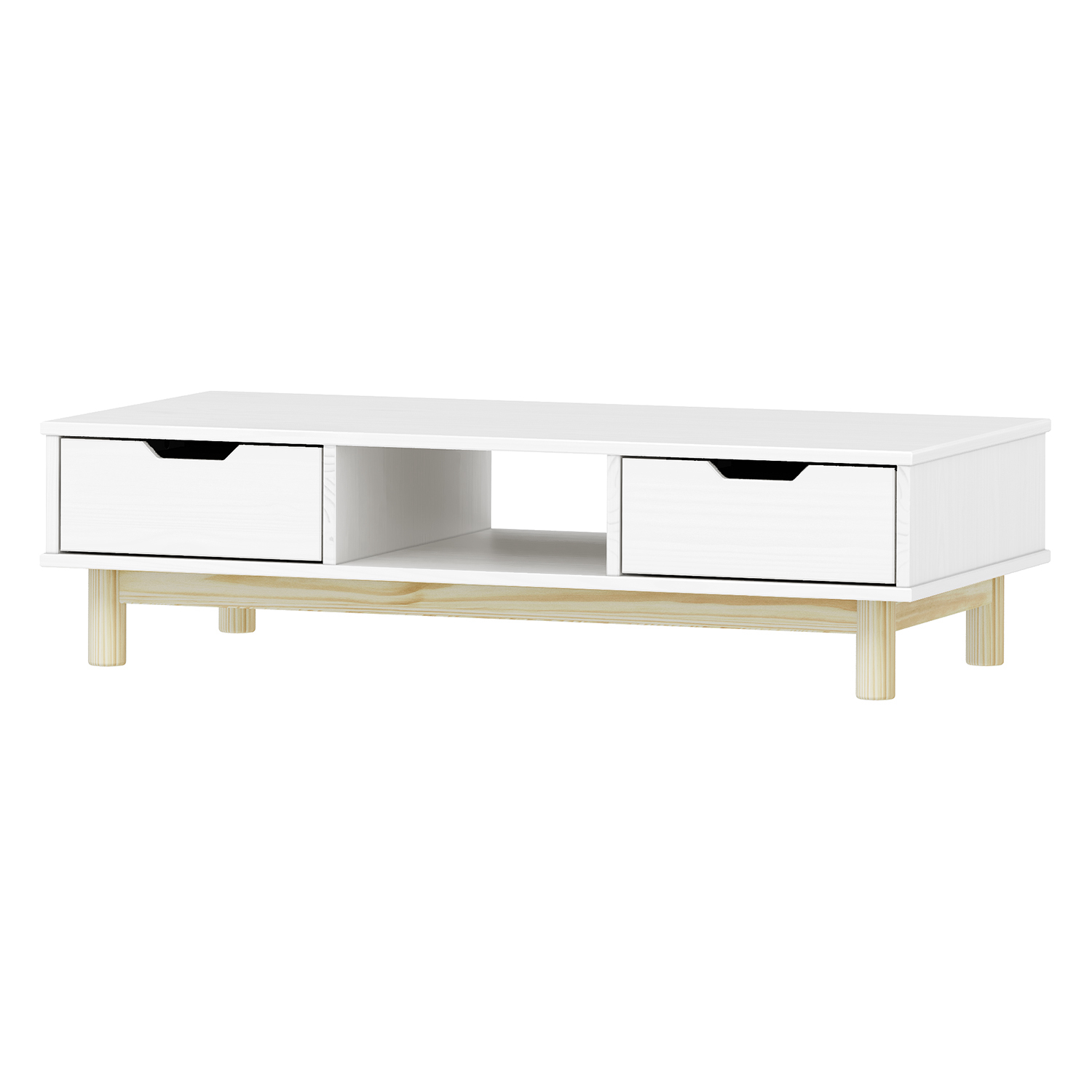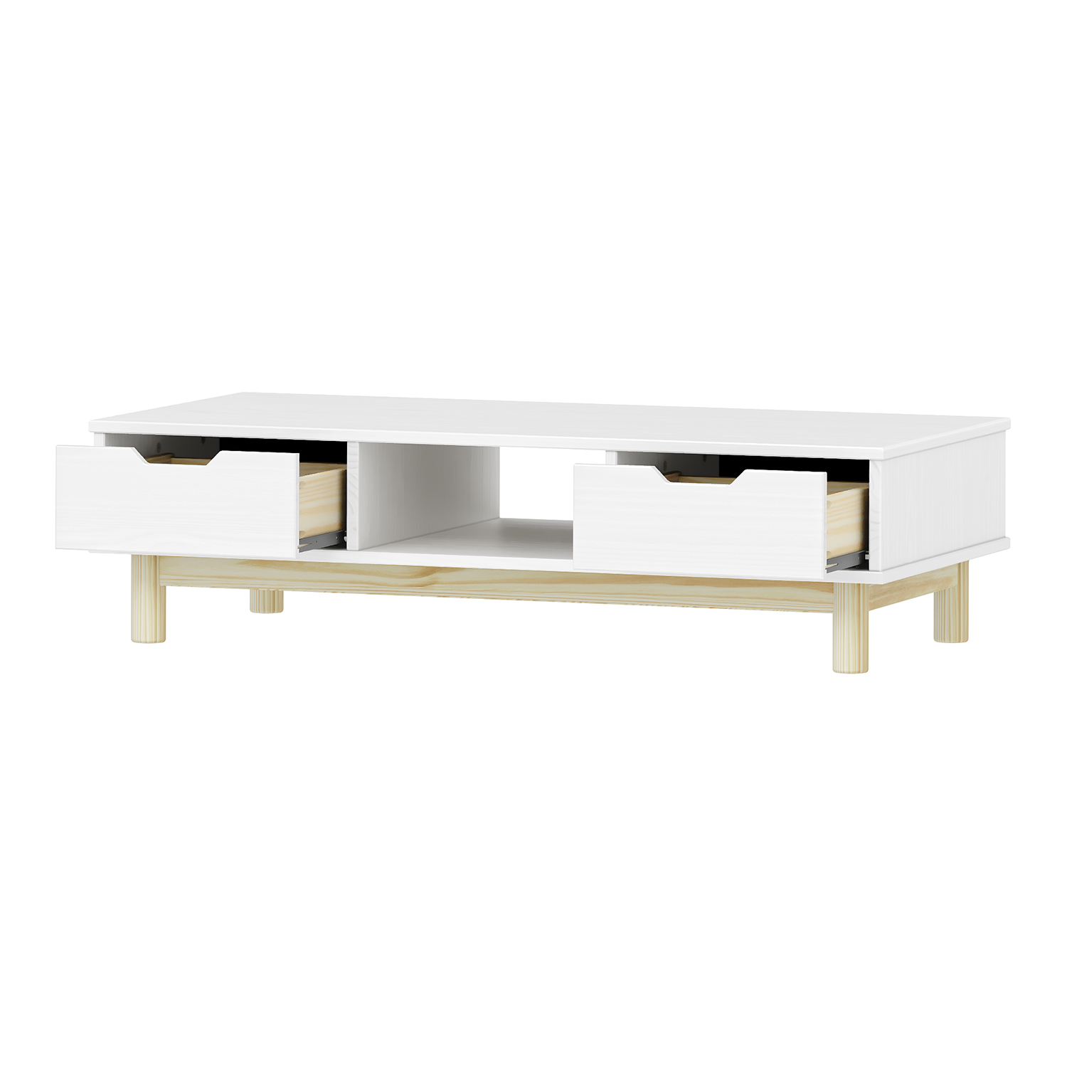 materiál masív borovica, lakované prevedenie 2 zásuvky s kovovými pojazdmi, 1 dvierka, 1 polica otvor na pretiahnutie káblov