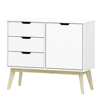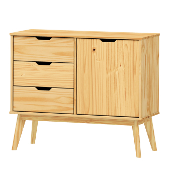 Kód produktu: 22431Vmateriál masív borovica, lakované prevedenie 3 zásuvky s kovovými pojazdmi, 1 dvierka, 1 polica