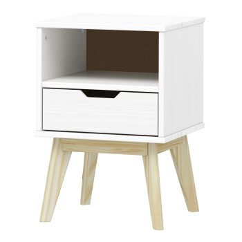 Kód produktu: 22435materiál masív borovica, farebné prevedenie biely lak 1 zásuvka s kovovými pojazdmi, 2 dvierka, 1 polica