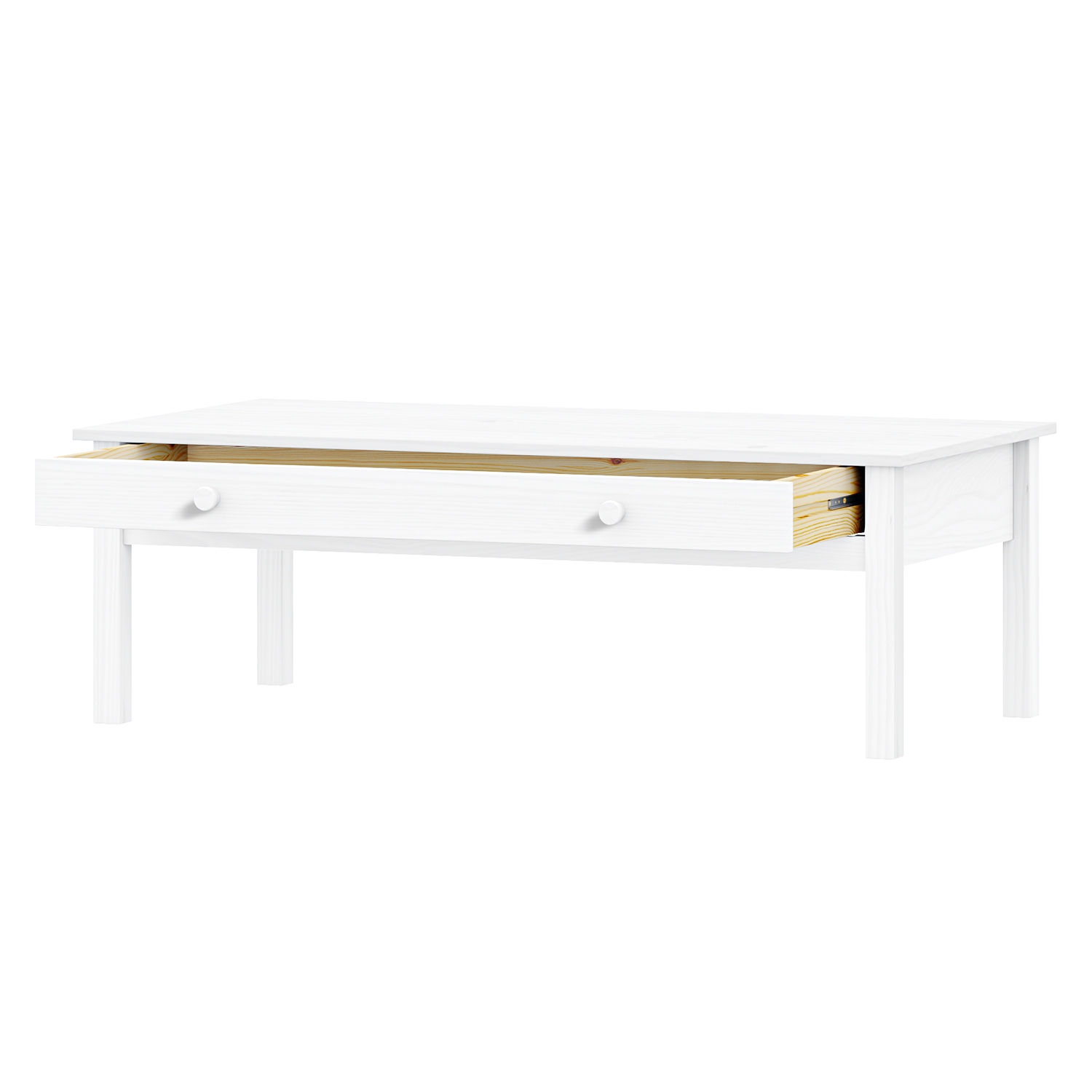 Konferenčný stolík TORINO 8092B v bielom prevedení z masívnej borovice je skvelým spoločníkom do každej svetlo zariadenej obývačky. Stolík je vybavený širokou zásuvkou s kovovými pojazdmi. Vďaka nej nemusíte mať všetky veci odložené na stolíku a jednoducho ich do zásuvky schováte, aby neboli na očiach. Na konferenčný stôl TORINO potom môžete odložiť nejaké dekorácie a sviečky, ktoré ho krásne ozdobia a vytvoria tak príjemnú atmosféru celej obývačky. Stôl TORINO odporúčame zakupovať v kombinácii s nábytkom z rovnakej série. Vaša domácnosť potom bude pôsobiť zjednoteným a elegantným dojmom.