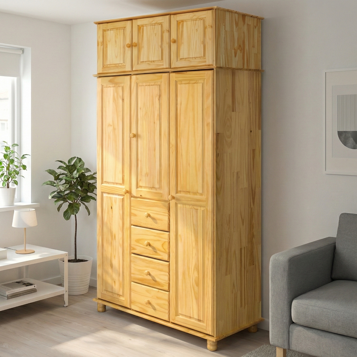Zadržte, namiesto vyhadzovania oblečenia ku skrini kúpte praktický nadstavec, ktorý vám ponúkne ďalší drahocenný priestor na uloženie vecí. Nadstavec 8864 je nadstavcom na trojdverovú lakovanú skriňu v prevedení masív borovica. Pokiaľ sa teda skriňa 8863 alebo 8851 nachádza vo vašej domácnosti, máte vyhrané. Tento nadstavec však možno použiť aj samostatne. Nadstavce sú skvelým riešením, pokiaľ vám dochádza priestor v skrini, ale aj v prípade, že potrebujete uskladniť sezónne oblečenie či uložiť posteľnú bielizeň. Veci, ktoré sa nachádzajú v nadstavci pri strope totiž budú horšie dostupné, než tie poskladané vo vašej skrini. Nadstavec 8864 je rozdelený na dva priestory, širší opatrený dvoma dvierkami a užší s jednými dvierkami. Ukladajte všetky veci na jednom mieste, nadstavec vám ušetrí miesto v izbe a na skrini 8863 alebo 8851 bude skvele sedieť.