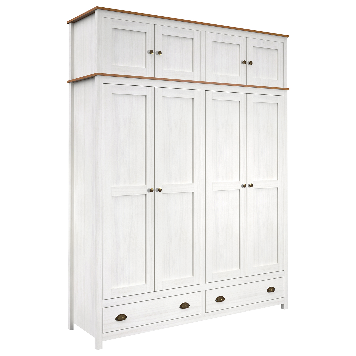 Kód produktu: 206263materiál masív borovica, farebné prevedenie biely / hnedý lak tri zásuvky s kovovými úchytkami a pojazdmi v ľavej a pravej časti 1 polica a kovová šatníková tyč, v strednej časti 3 police, na dvoch stredných dverách je zrkadlo nadstavec je súčasťou dodávky