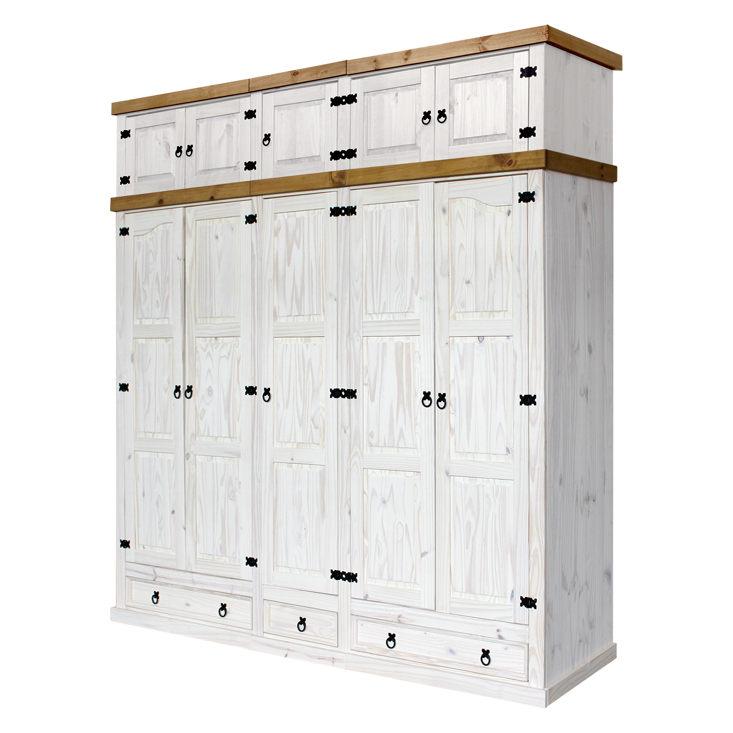 Kód produktu: 16254Bmateriál masív borovica voskovaná v bielom odtieni horný lem masív borovica voskovaná v medovom odtieni priestor delený v pomere 2:1:2 v oboch širších častiach šatníková tyč a polica na klobúky, stredná užšia časť 3 variabilné police v spodnej časti 2 veľké a 1 malá zásuvka, kovové ozdobné úchytky odporúčaný nadstavec 16953B súčasť zostavy Corona biela