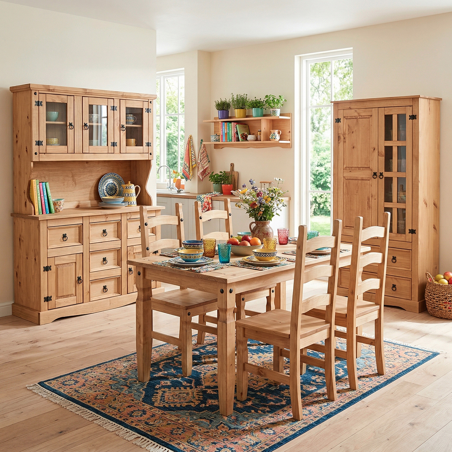 Jedáleň zariadená nábytkom Corona bude vyzerať veľmi dobre, či už nábytok Corona zvolíte pre jedáleň vo vašej domácnosti alebo pre tú na chalupe alebo chate. Okrem pekného jedálenského setu by priestor mal byť vybavený aj praktickým nábytkom vhodným na uloženie vecí, komoda je teda absolútnou nevyhnutnosťou. Ak však chcete riad a potreby do kuchyne nielen schovávať, ale aj vystaviť na obdiv všetkých stravníkov, potom odporúčame komodu ešte opatriť jedinečným nadstavcom. Nadstavec príborníka 3 dvere CORONA vosk je rovnako ako ostatný nábytok Corona vyrobený z masívu borovica a voskovaný v krásnom medovom odtieni. Nadstavec je vhodný na komodu Corona vosk 1639 alebo 1632. Nadstavec obsahuje pevnú policu, ktorá sa nachádza za presklenými dvierkami, ihneď tak vidíte vystavený riad. Trojdverový nadstavec je zdobený čiernymi detailmi, úchytkami a pántami. Nadstavec umiestnený na komode bude vyzerať perfektne a priestor krásne zabýva. V jedálni zariadenej krásnym rustikálnym nábytkom bude radosť stolovať aj oslavovať, pozvite priateľov k prestretému stolu a náležite sa pochváľte nielen kuchárskym umením, ale aj dobrým vkusom.