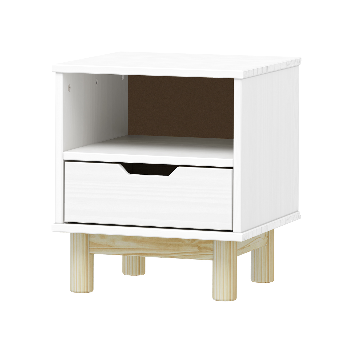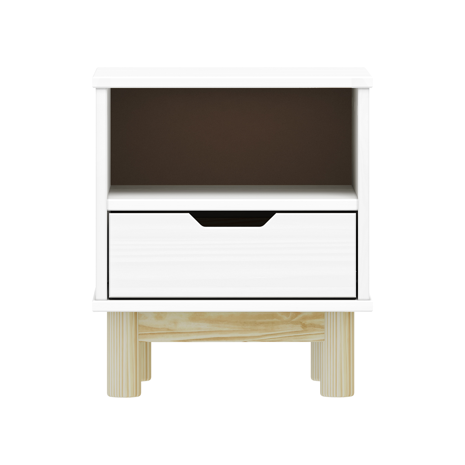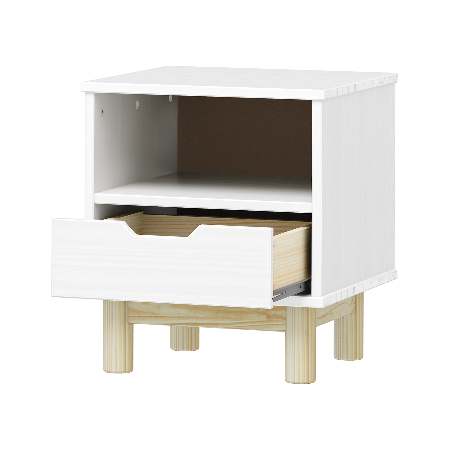 Kód produktu: 32435materiál masív borovica, farebné prevedenie biely lak 1 zásuvka s kovovými pojazdmi, 2 dvierka, 1 polica