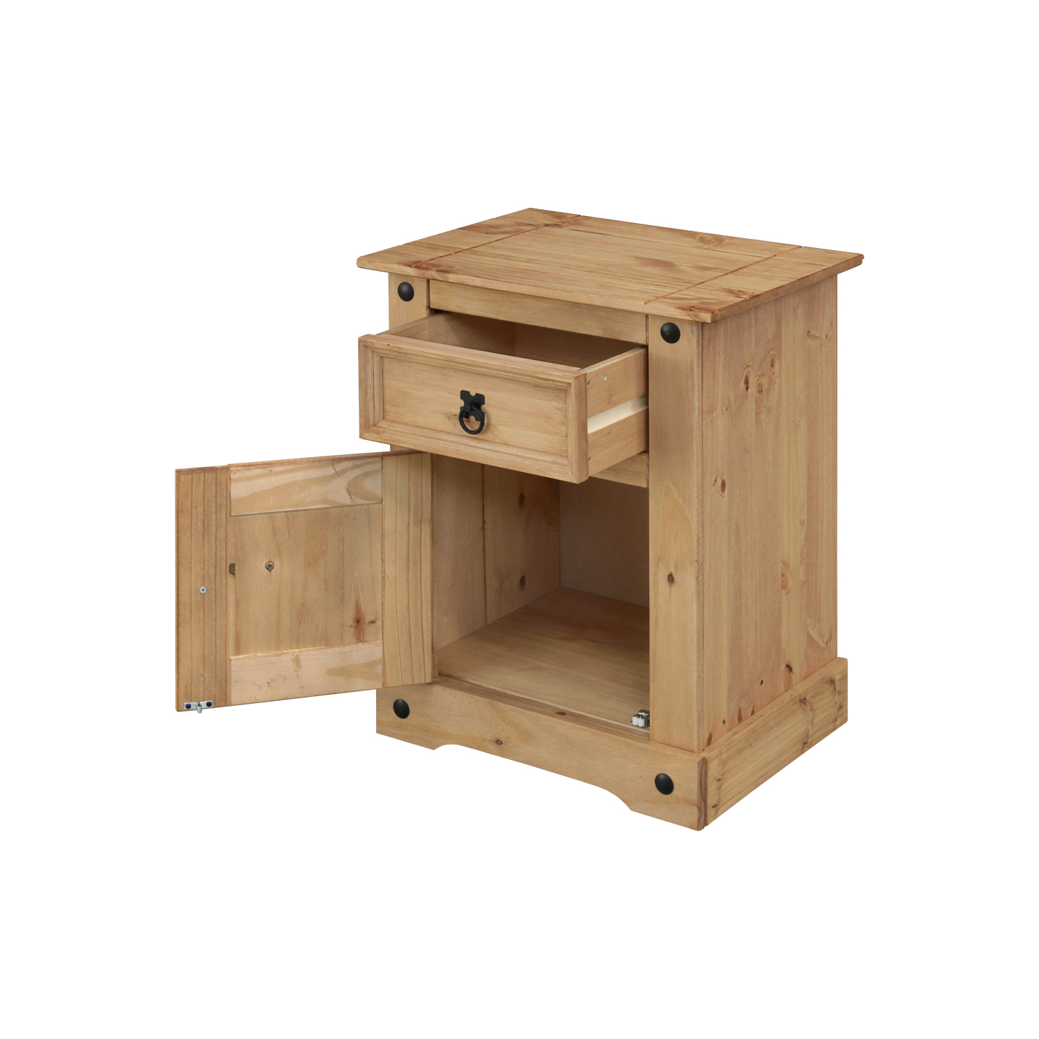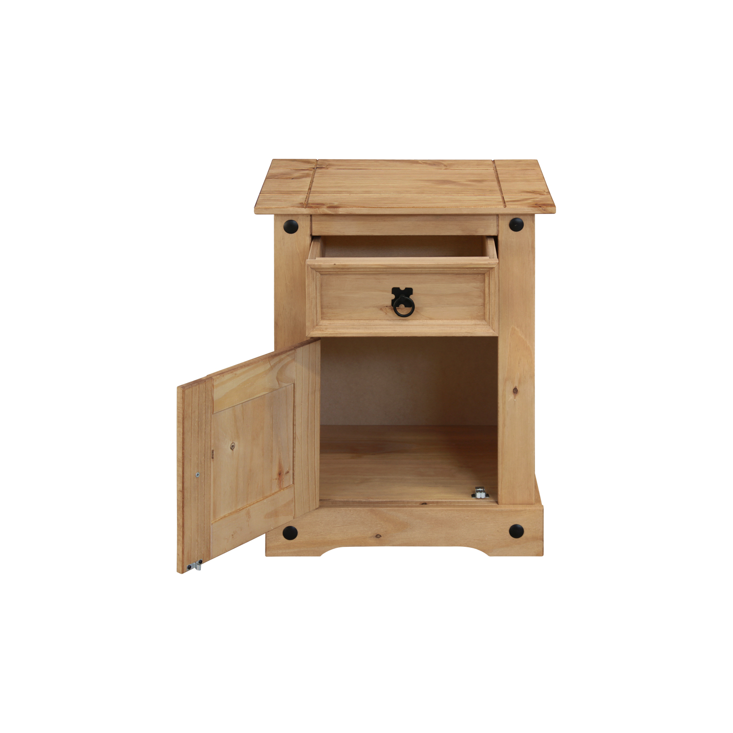 materiál masív borovica voskovaná v medovom odtieni 2 zásuvky, 1 otvorená polica, kovové ozdobné úchytky súčasť zostavy Corona 3