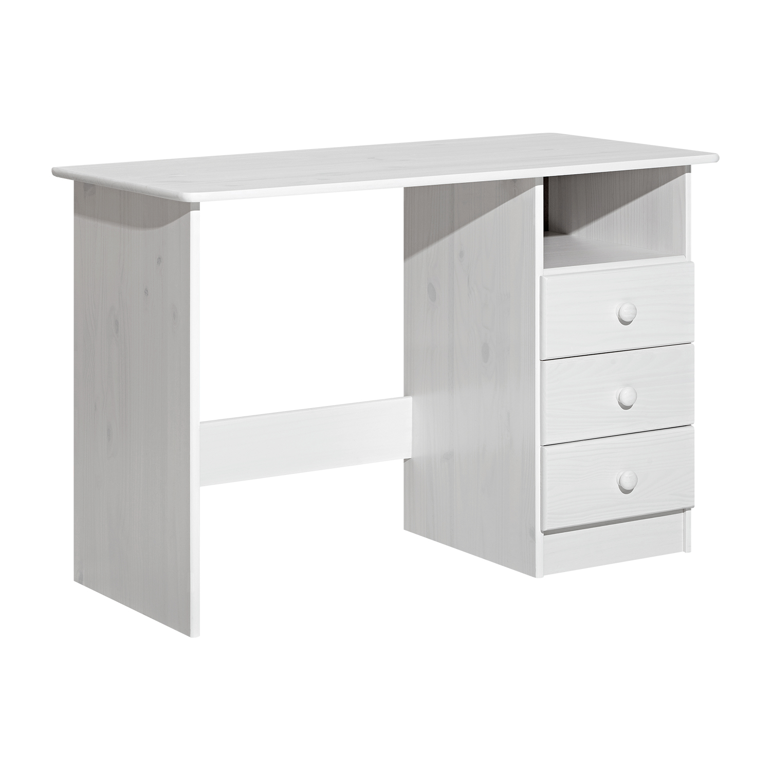 Detská izbička či študentská izba zariadená nábytkom v prevedení masív biely lak bude úplne perfektná. V izbe určenej na odpočinok, zábavu aj štúdium je potrebný poriadny písací stôl. PC stôl 88448 v prevedení masív borovica splní vaše predstavy o kvalitne zariadenom pracovnom prostredí. Biely stôl obsahuje tri zásuvky s kovovými pojazdmi s montážou možnou iba na pravú stranu. Do zásuviek uložíte dokumenty, učebnice aj najrôznejšie kancelárske veci potrebné pri práci a učení. Rozčítanú knihu či rozrobenú prácu potom odložíte do priestoru nad zásuvkami. Za pevným masívnym stolom budete sedieť pri práci na počítači, pri čítaní kníh aj kreslení a maľovaní. Pekné a kvalitne vybavené pracovné prostredie je základom každého úspechu, vytvorte deťom izbičku, v ktorej bude radosť učiť sa nové veci aj kreatívne tvoriť.