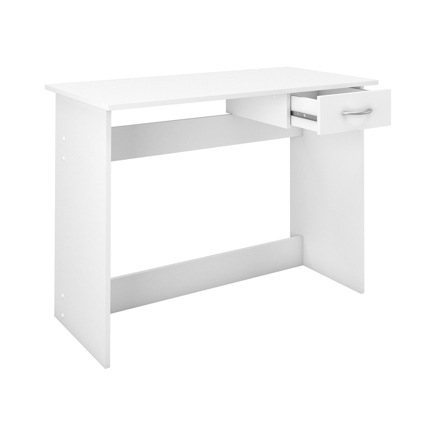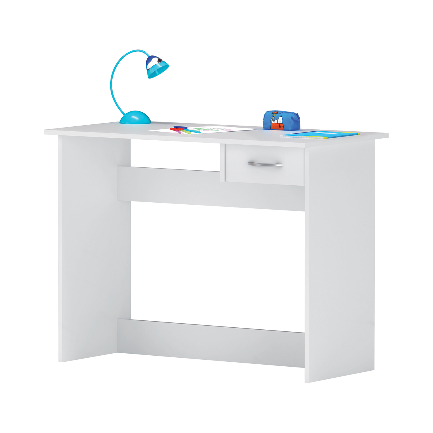 Biely písací stôl ALPIN 828 je jednoduchý stôl pre každého, kto nie je extra náročný pri výbere. Je vybavený jednou zásuvkou s kovovými pojazdmi. Do zásuvky si môžete uschovať dokumenty, aby neboli každému na očiach na vašom stole. Na stôl potom odložíte notebook či klasický stolný počítač. Tu nie je veľa priestoru na vymýšľanie, ale veľmi na jednoduché usporiadanie. Stôl sa hodí do každej kancelárie, ale aj detskej izby. Na písanie úloh pre menšie dieťa bohato postačí. Biely stôl potom jednoducho skombinujete s ostatným bielym nábytkom.
