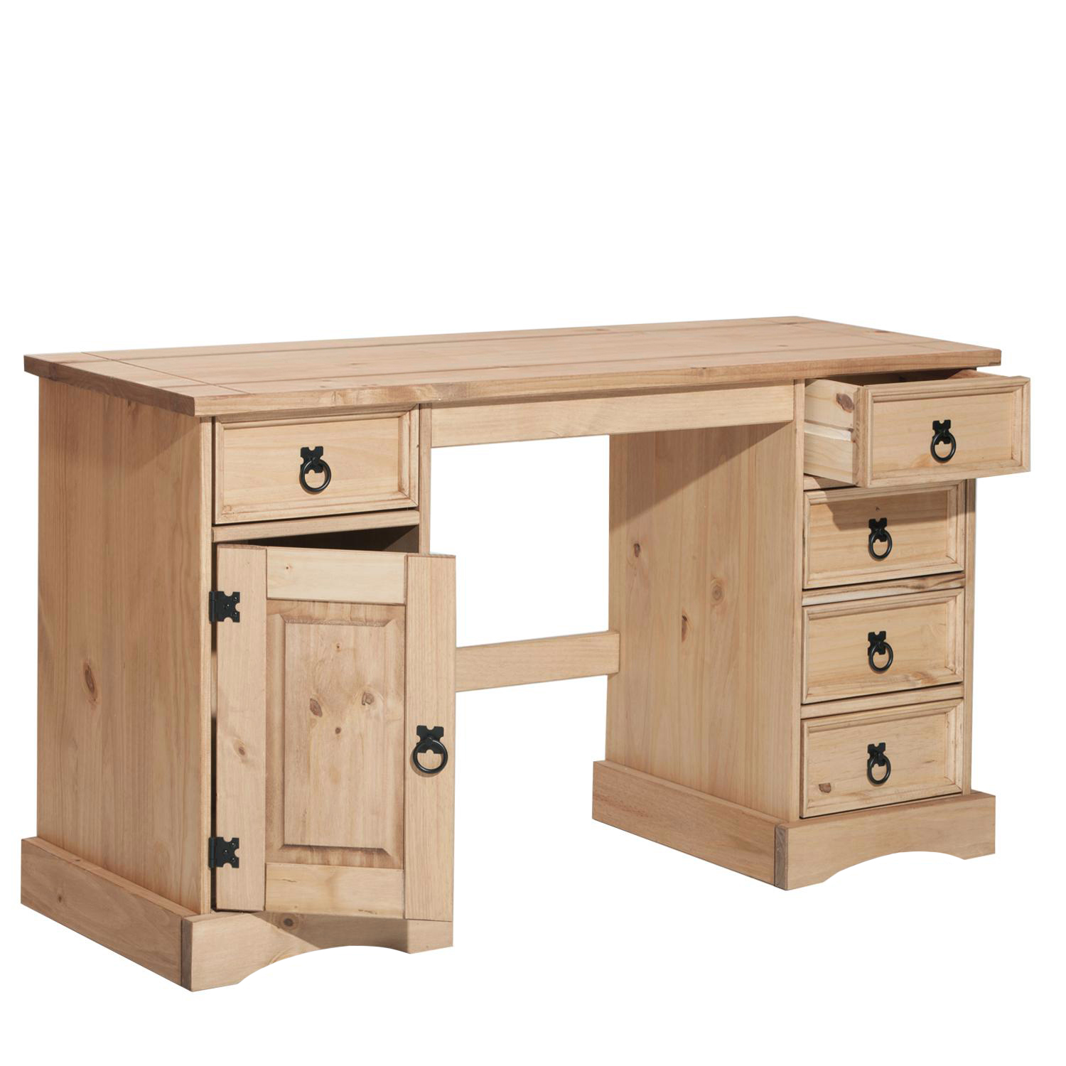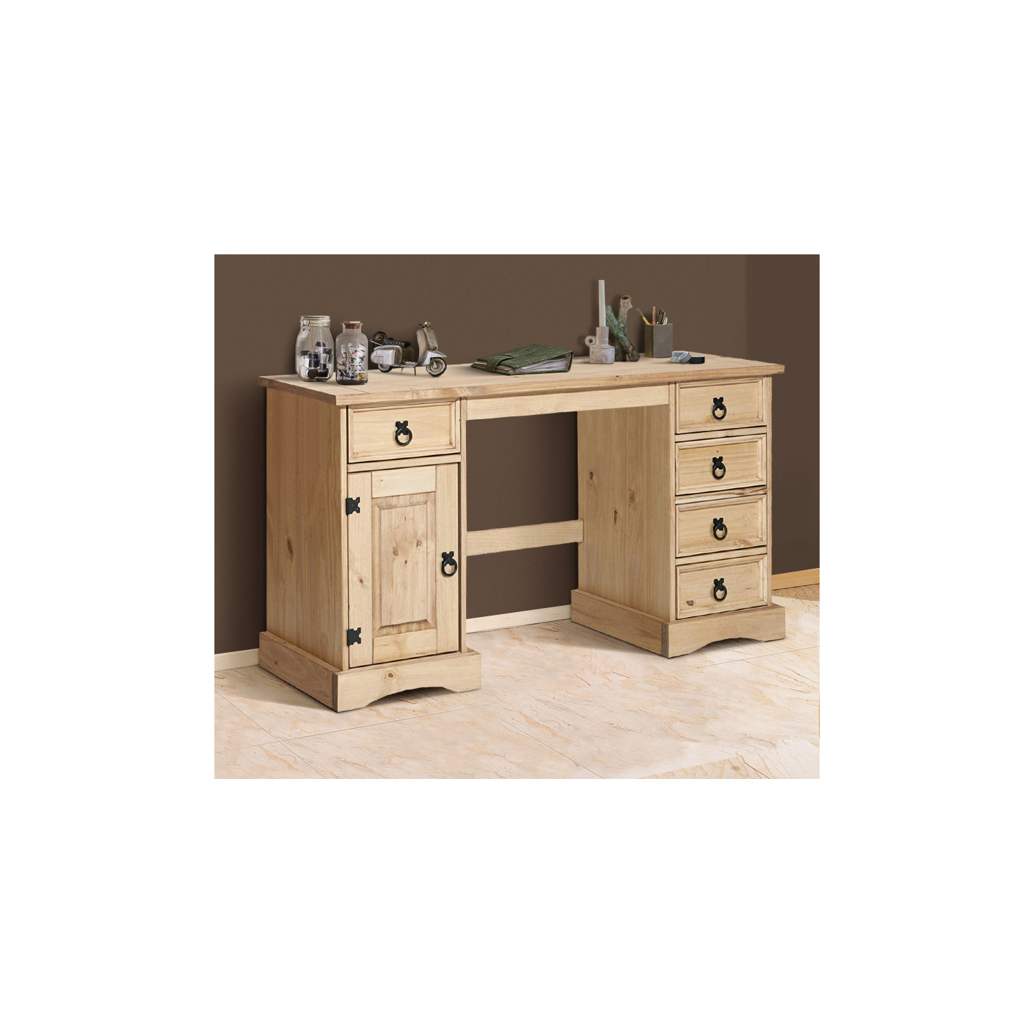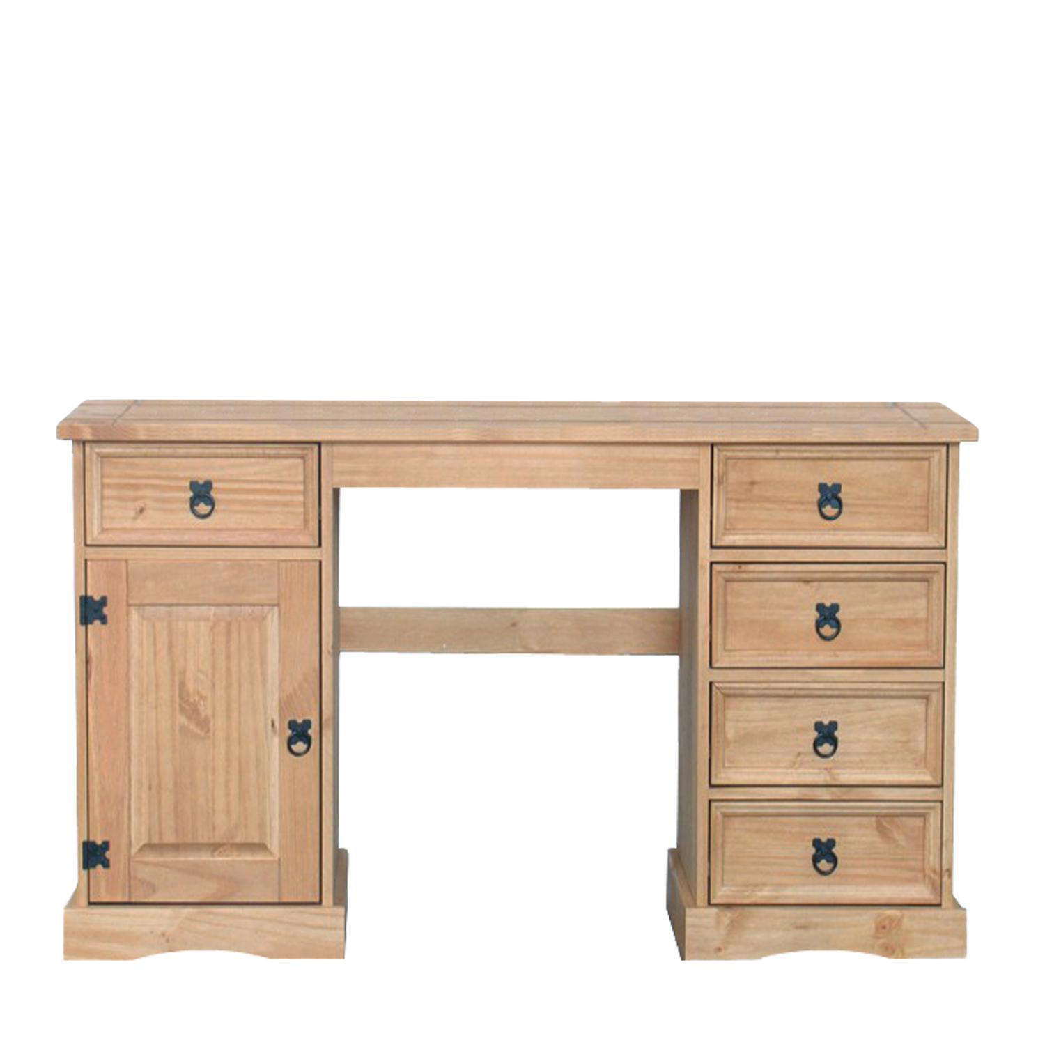 Rodení šéfovia pracujú vždy za poriadnym pracovným stolom. Písací stôl CORONA bude reprezentatívnym kúskom nábytku, ktorý dá vašej kancelárii luxusný vzhľad. Kvalitný stôl v prevedení masív borovica bude so cťou zdobiť vašu pracovňu. Dostatočný úložný priestor v podobe piatich malých zásuviek a väčšieho priestoru s dvierkami je tiež veľkou výhodou tohto pracovného stola, uložíte doň všetky dokumenty potrebné na prácu. Príťažlivý dizajn stola pripomínajúci starožitný nábytok dá na obdiv váš vycibrený vkus a kancelária tak získa väčšiu vážnosť. Dokonalý kúsok nábytku ošetrený voskovaním v medovom odtieni si zaručene zamilujete. Zdobené kovové úchytky na zásuvkách aj výrazné pánty na dvierkach robia z tohto stola skutočný unikát. Časom získa stôl požadovanú patinu a vaše vnúčatá už môžu tvrdiť, že je to starožitný kúsok po pradedovi.
