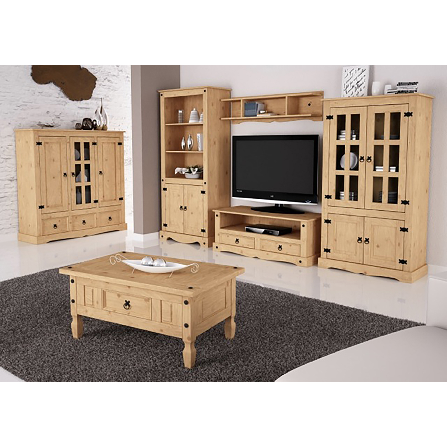 Kód produktu: 1639materiál masív borovica voskovaná v medovom odtieni presklená časť, 3 police, 1 plná dvierka, 2 veľké zásuvky hĺbka zásuvky 32 cm, kovové ozdobné úchytky súčasť zostavy Corona