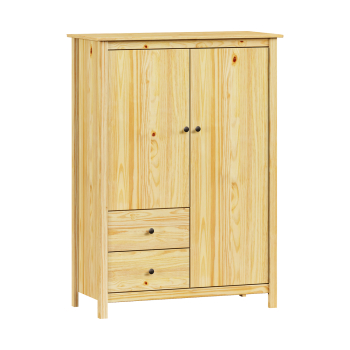 Kód produktu: 8063Kmateriál masív borovica, lakované prevedenie kovové úchytky vo farebnom prevedení černená mosadz priestor delený na polovice v ľavej polovici šatníková tyč a polica na klobúky v pravej polovici 3 police v spodnej časti 2 zásuvky s kovovými pojazdmi odporúčaný nadstavec 8168K