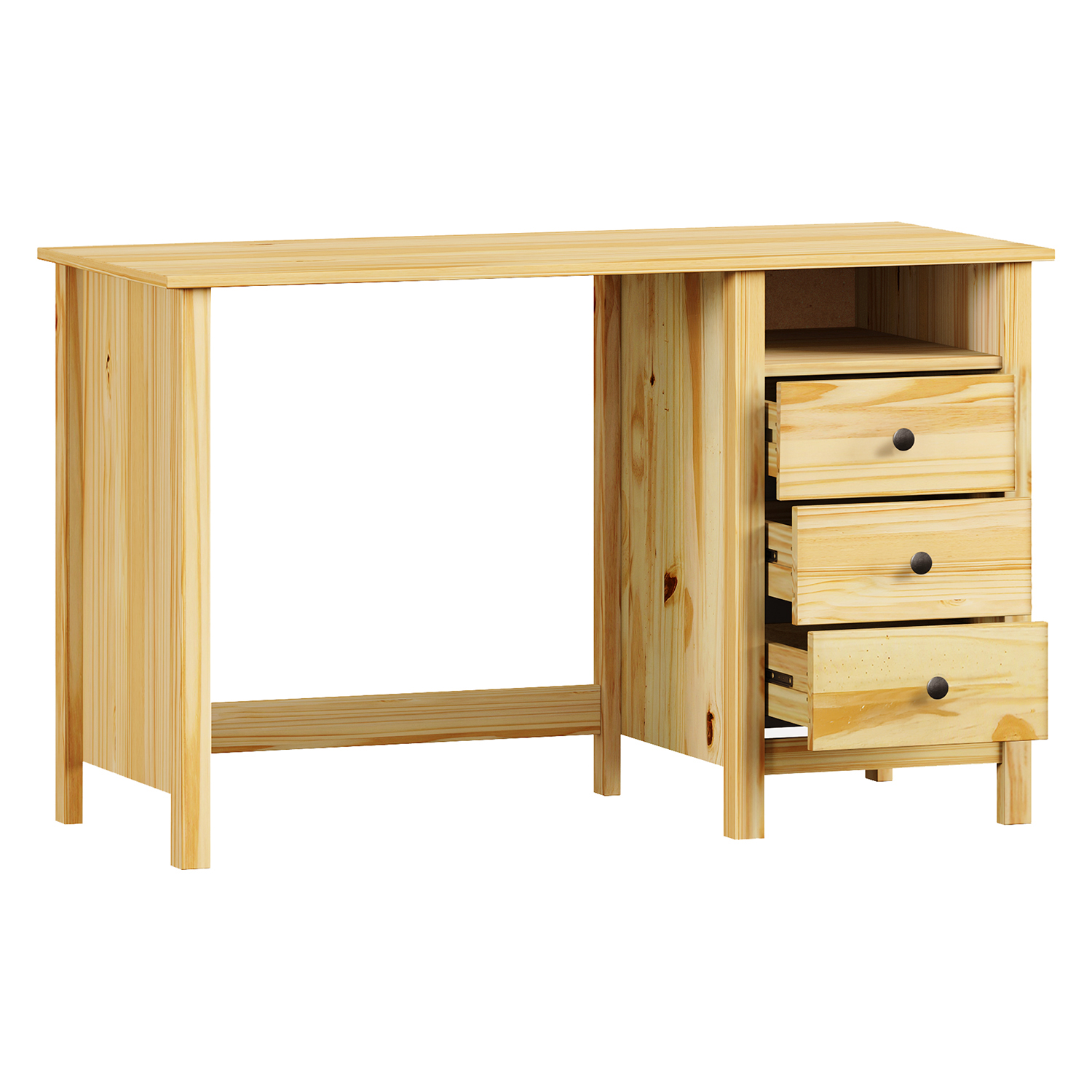 Kód produktu: 8073Kmateriál masív borovica, lakované prevedenie kovové úchytky vo farebnom prevedení černená mosadz 2 otvorené police, 1 dvierka a 3 zásuvky s kovovými pojazdmi výsuv nie je súčasťou dodávky k stolu je možné dokúpiť výsuvnú dosku na klávesnicu 8840
