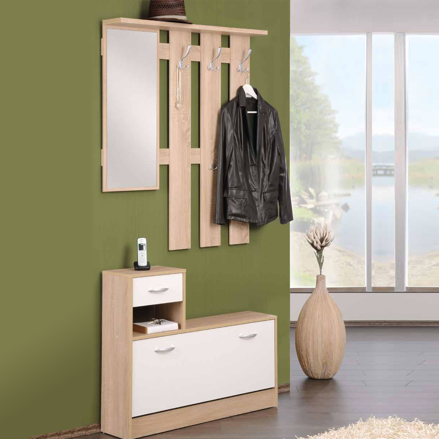 Krásnym nábytkom vybavená predsieň je základom upraveného a pohodového bývania. Akonáhle totiž vstúpite do vášho bytu, mal by sa vás zhostiť pokoj a úplné uvoľnenie. Predsieňová stena tak nesmie chýbať v žiadnej domácnosti, pretože krásne uprataná a prehľadne zrovnaná vstupná miestnosť je na nezaplatenie. Rozhádzané topánky a pohádzané zvršky žiadnej žene na pokoji nepridajú. Predsieňová stena dub Sonoma / biela dá miestnosti elegantný a upravený vzhľad. Praktická stena sa skladá z jednoduchého výklopného botníku, ktorý má okrem priestoru na uloženie topánok aj zásuvku na umiestnenie kľúčov a zrkadla spojeného s vešiakom. Vešiaková stena obsahuje tri trojháčiky a jeden dvojháčik, zavesíte tak na ňu kabáty, ale aj dôležitý dáždnik. Do výklopného botníku sa zmestí až 8 párov topánok, čo je ideálne práve pre jednočlennú či dvojčlennú domácnosť. Táto predsieňová stena je vhodná do malých bytov či garsónok, nezaberie totiž toľko priestoru a chodba bude vyzerať vždy upravene. Vstúpte do príjemnej a pokojnej atmosféry vášho domova a stres nechajte za dverami vášho bytu.