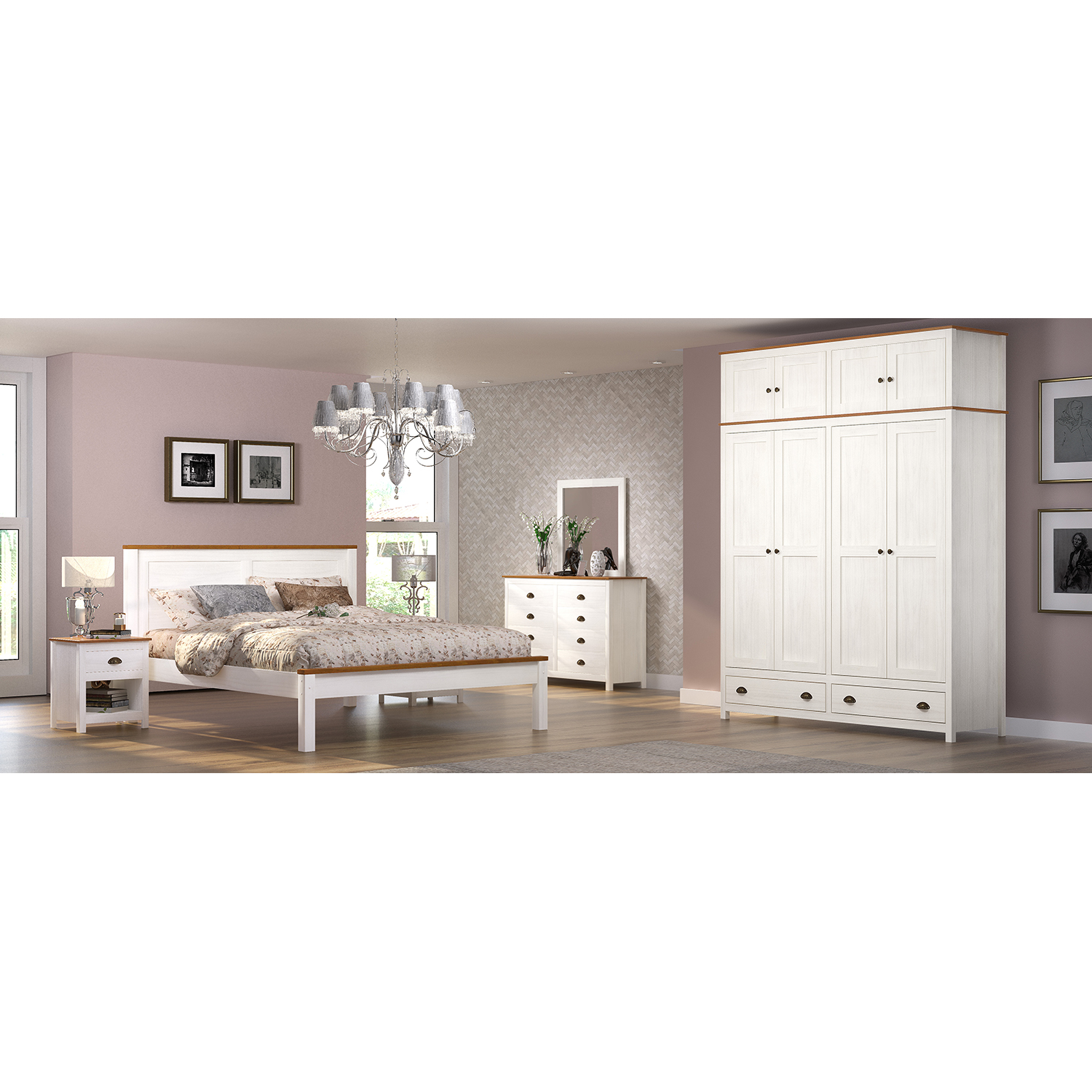 Kód produktu: 206263materiál masív borovica, farebné prevedenie biely / hnedý lak tri zásuvky s kovovými úchytkami a pojazdmi v ľavej a pravej časti 1 polica a kovová šatníková tyč, v strednej časti 3 police, na dvoch stredných dverách je zrkadlo nadstavec je súčasťou dodávky