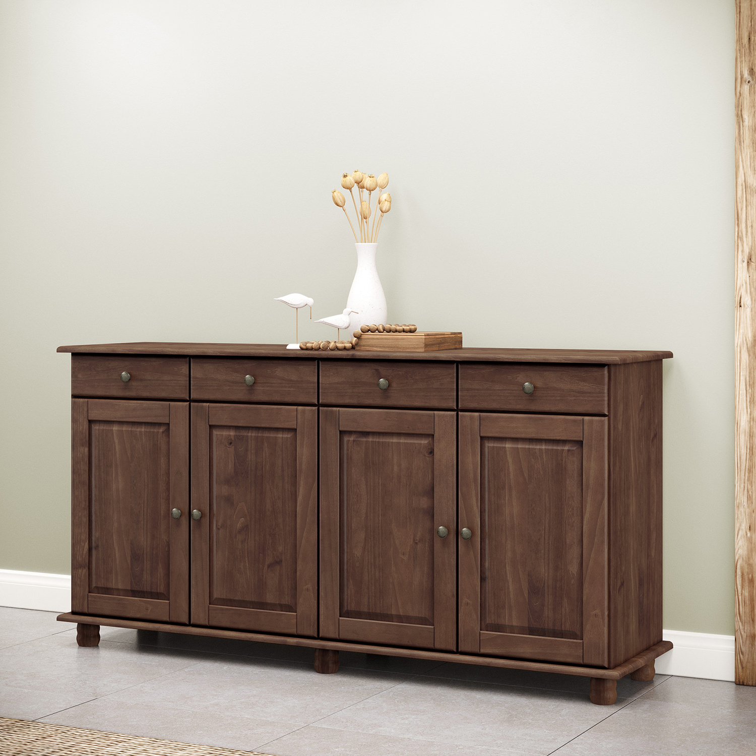 Príborník RUBI v tmavo hnedom prevedení je dôkazom, že poctivý drevený nábytok stále drží krok s dnešným svetom. Jeho konštrukcia z masívu borovica mu dodáva nielen pevnosť, ale aj charakter. Povrchová úprava tmavým lakom zvýrazňuje kresbu dreva a podčiarkuje jeho prirodzenú krásu. Tento príborník ponúka štvory dvere a štyri zásuvky, čo z neho robí multifunkčný kúsok na každodenné použitie. Zásuvky s kovovými pojazdmi zaisťujú hladké otváranie a poskytujú priestor pre príbory, drobnosti alebo dokumenty, ktoré potrebujete mať po ruke. Za plnými dvierkami sa skrývajú vnútorné police ideálne na uloženie riadu, textilu alebo čohokoľvek, čo si zaslúži svoj vlastný priestor. Celok pôsobí robustne, ale nijako nezahlcuje interiér. Vďaka jednoduchému dizajnu a kovovým úchytkám zapadne do tradičného aj modernejšieho prostredia. Tento kúsok nábytku je praktický, ale nie je nudný. Je nenápadný, a pritom dôležitý.
