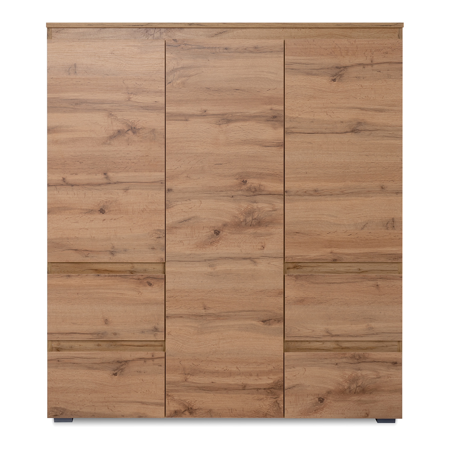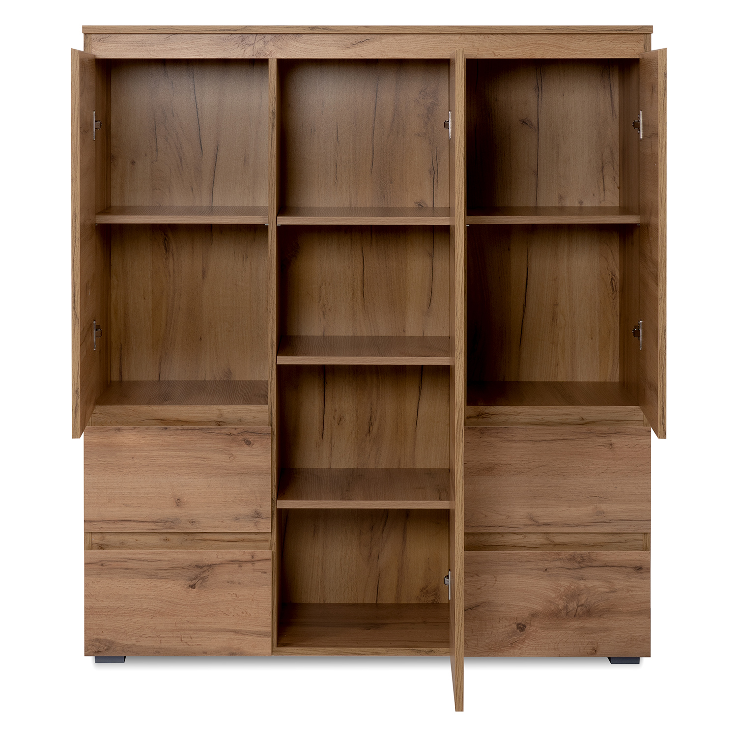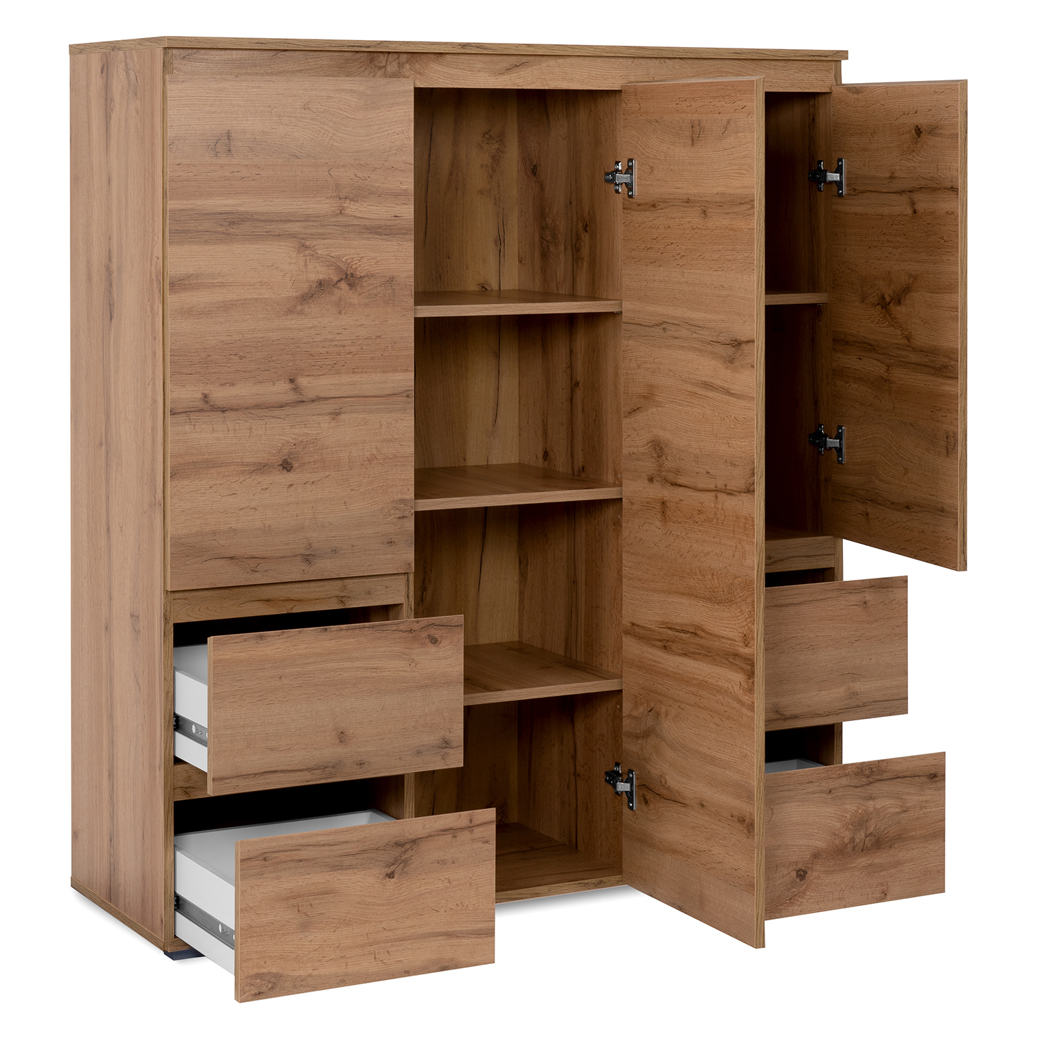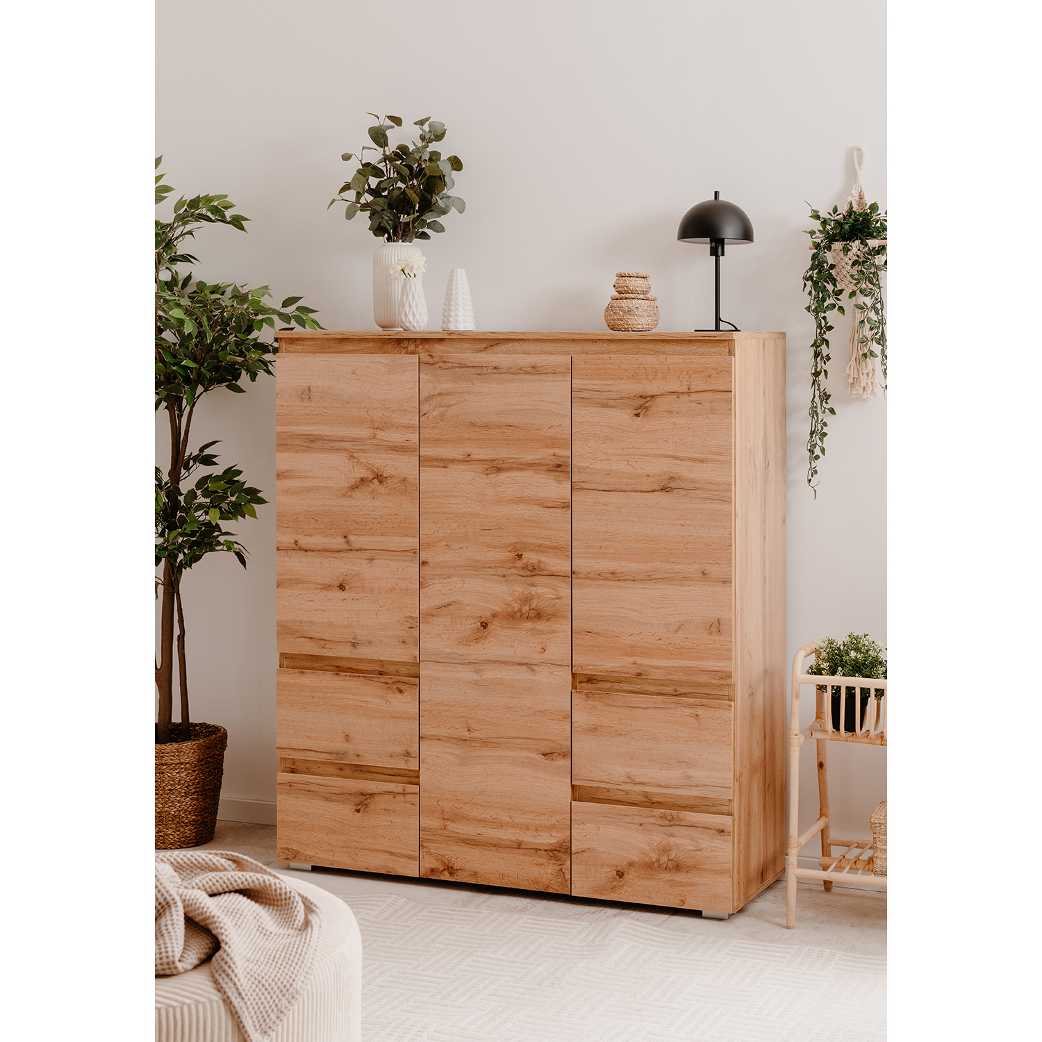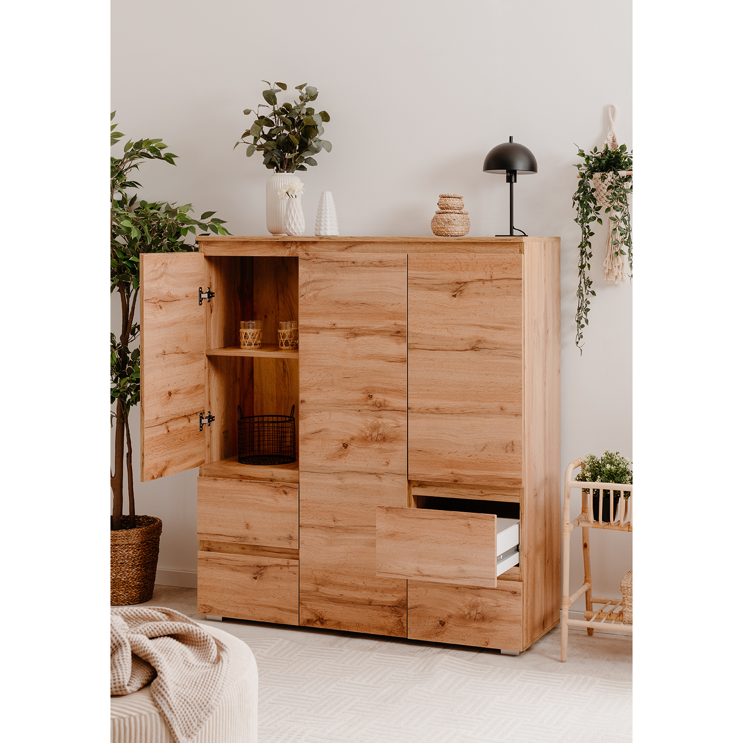 Príborník v elegantnom farebnom prevedení zlatého duba prináša do vášho domova šmrnc a štýl. Jeho dizajn kombinuje praktickú funkčnosť s estetickým vzhľadom, čo z neho robí ideálny doplnok pre každý interiér. Disponuje tromi dverami, ktoré ukrývajú päť variabilných políc, vďaka ktorým ľahko prispôsobíte úložný priestor vašim potrebám. Štyri zásuvky s kovovými pojazdmi poskytujú dostatok miesta pre všetky vaše drobnosti a zároveň zaisťujú plynulý a tichý chod. Tento príborník je skvelou voľbou pre tých, ktorí hľadajú spojenie kvality, praktickosti a nadčasového designu.