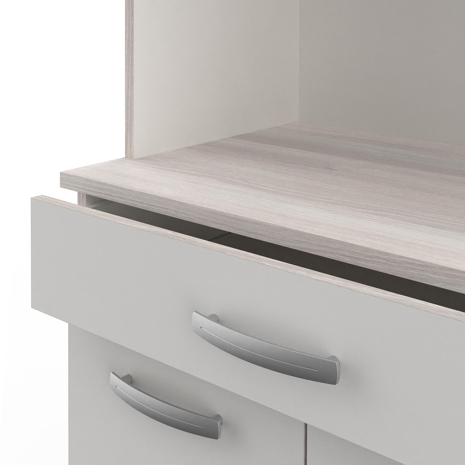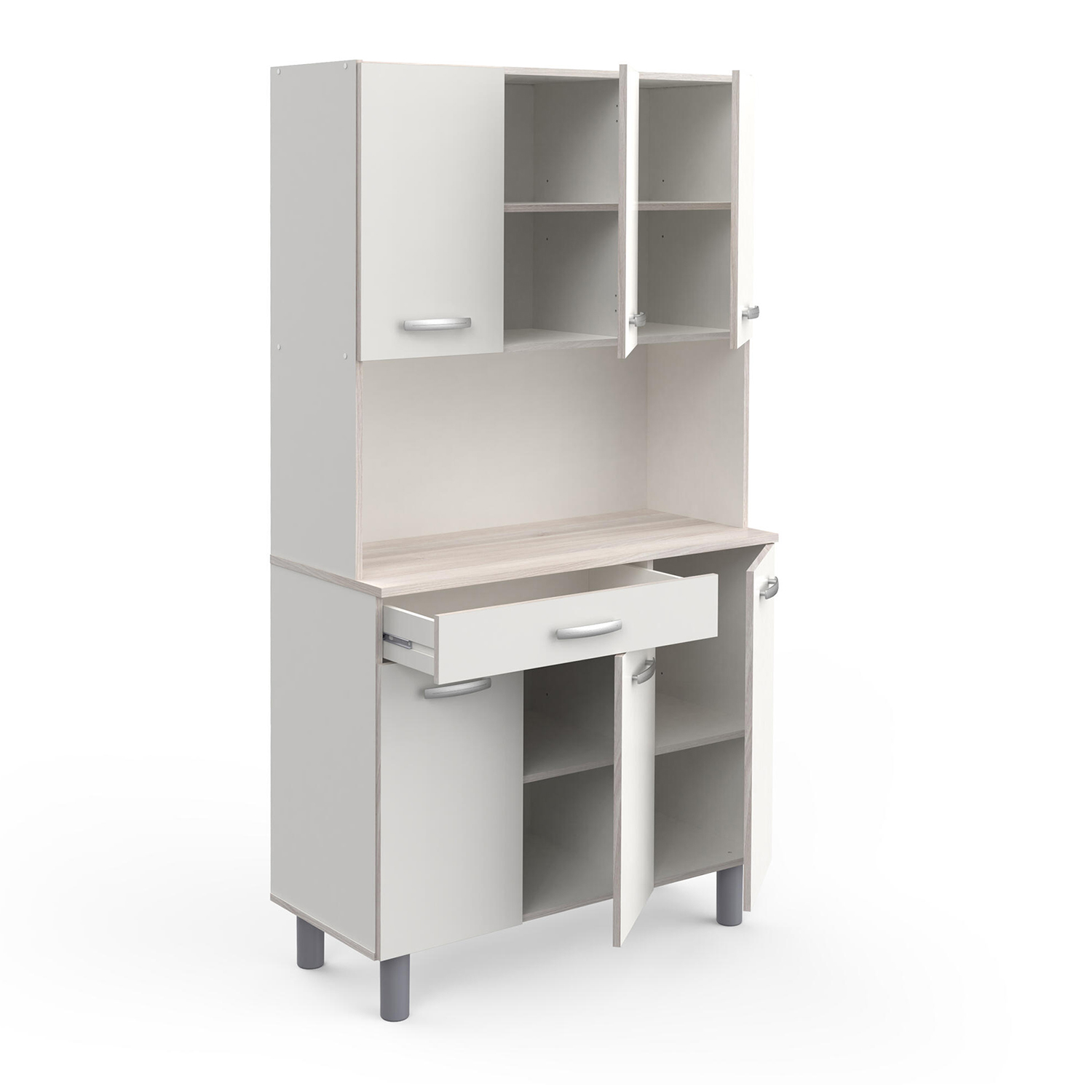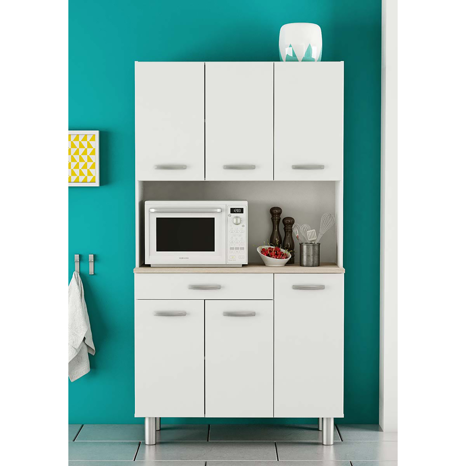 Príborník PASTA dokonale vyplní prázdnu časť vašej kuchyne. Ak máte v kuchyni viac riadu a náčinia alebo napríklad kávovar či voľne stojacu mikrovlnnú rúru, tento príborník sa vám bude určite hodiť. Je k dispozícii vo farebnom prevedení akácia / biela. V hornej časti sú 3 dvierka a v dolnej časti tiež 3 dvierka. Nad spodnými dvierkami sa nachádza jedna zásuvka s kovovými pojazdmi. V strednej časti je priestor na mikrovlnnú rúru alebo kávovar. Dokonale sa bude hodiť k vašej bielej kuchyni.
