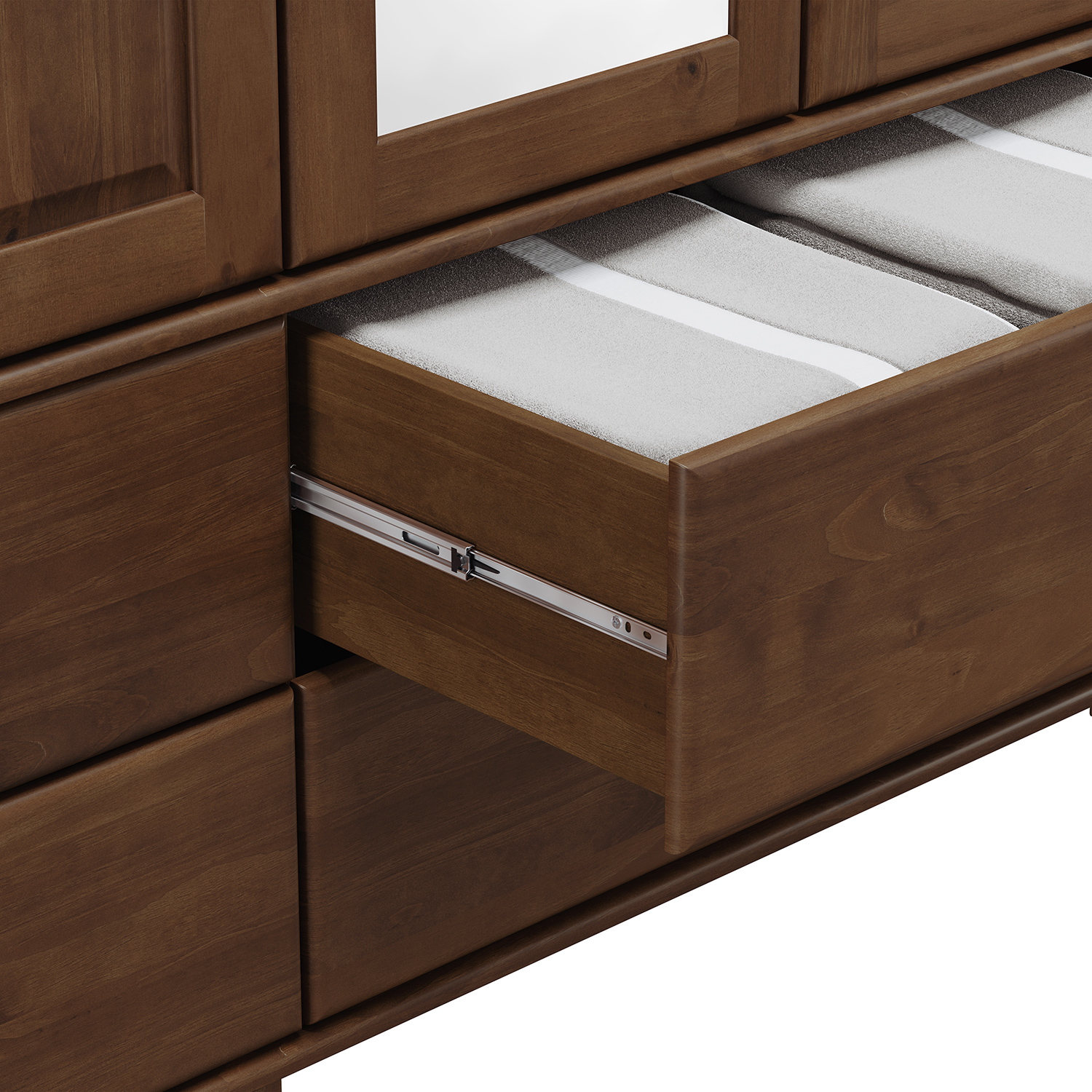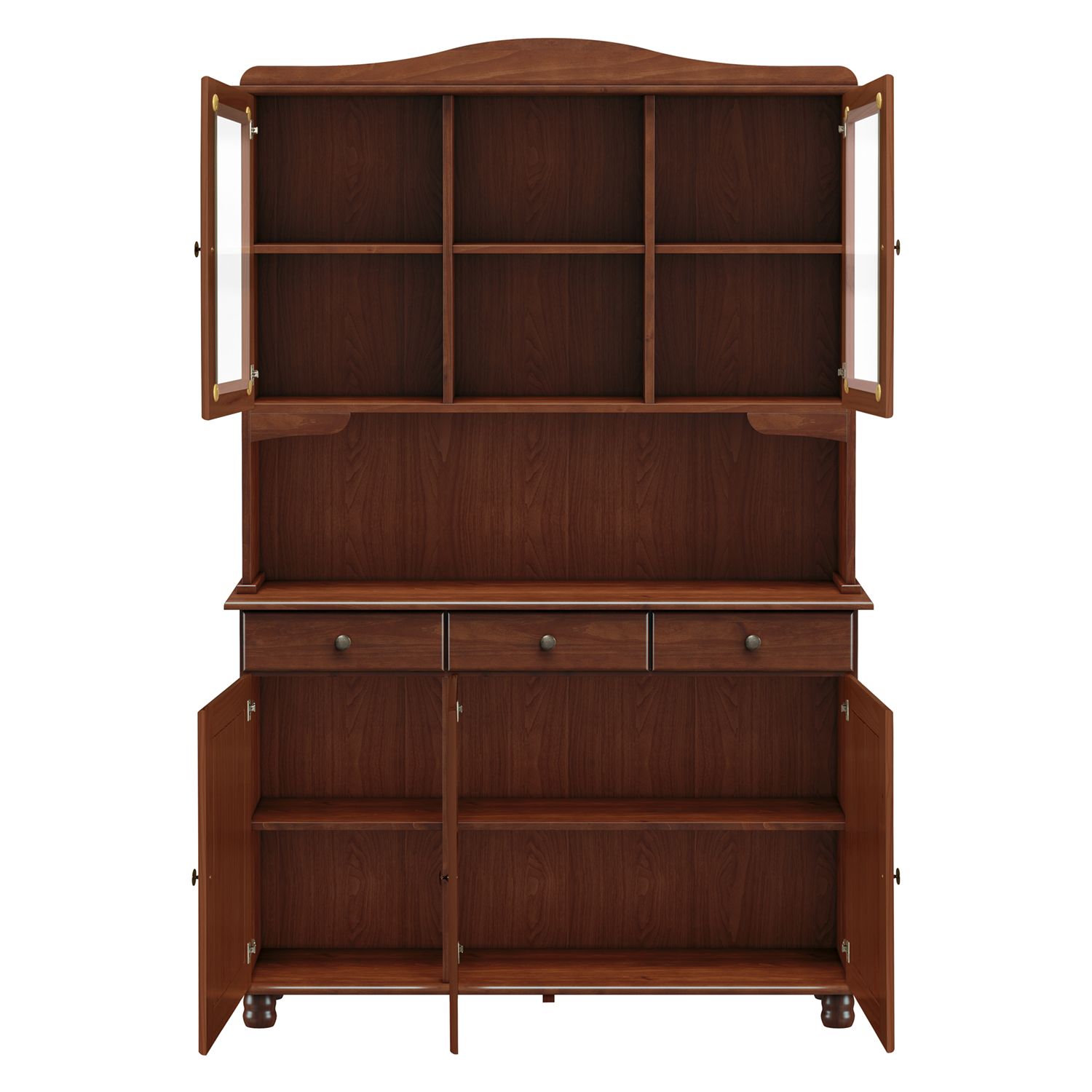 Už ste niekedy premýšľali, kam s tými krásnymi hrnčekmi a riadom po babičke? Príborník s nástavcom 3 dvere RUBI v tmavo hnedej farbe tento problém vyrieši. Dvierka vrchnej časti tohto príborníka sú presklené, tu vaše výstavné kúsky krásne vyniknú. Medzi nimi sa nachádza priestranná otvorená polica. V strednej časti je dostatok priestoru na umiestnenie napríklad kávovaru na prípravu kávy pre vašich hostí. V spodnej časti sú 3 zásuvky s kovovými pojazdmi na príbory a drobnosti. Pod zásuvkami je skrinka s 3 dvierkami, za ktorými sa skrýva priestranná polica. Sem si teda môžete uložiť zvyšok vecí, ktoré chcete mať po ruke, ale nepotrebujete, aby boli na očiach alebo aby sa na ne prášilo.