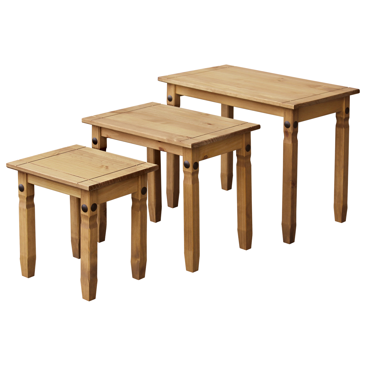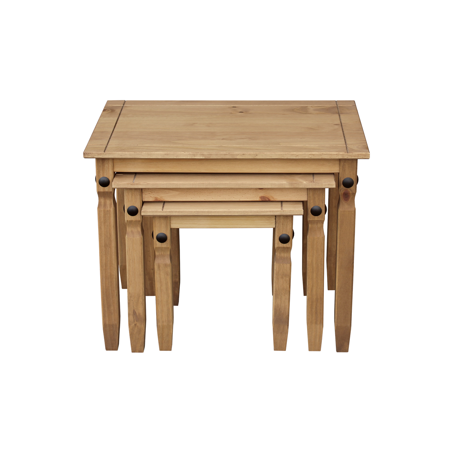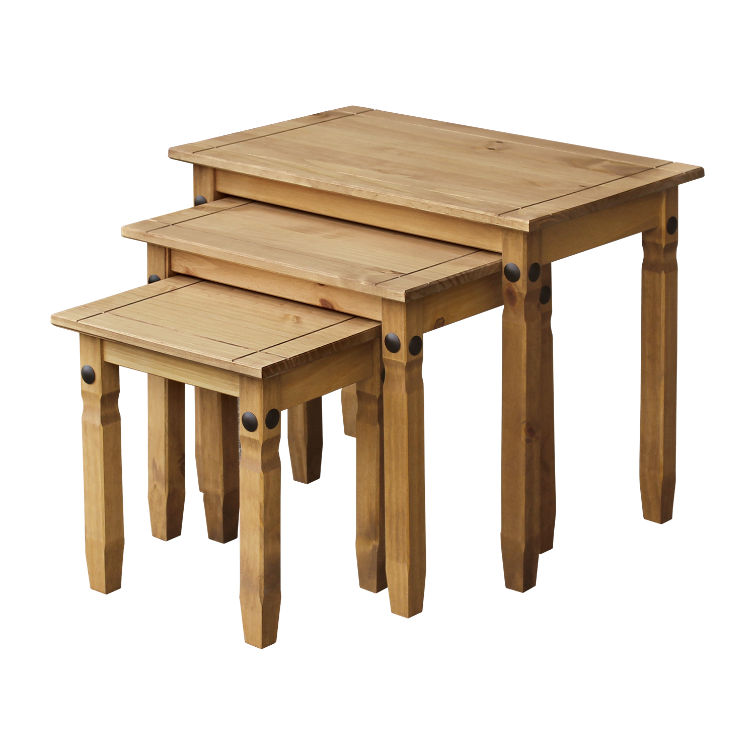 Pokiaľ je vaša obývacia izba zariadená nábytkom zo zostavy Corona, potom určite hľadáte doplnky, ktorými tento priestor ešte lepšie ozdobíte a celkovo zabývate. Sada 3 stolíkov CORONA je skvelou voľbou pokiaľ potrebujte do izby umiestniť najrôznejšie dekorácie a kvetiny. Stolíky je možné rozostavať bok po boku, alebo ich nechať voľne rozmiestnené po izbe. Na oživenie priestoru vám tieto stolíky urobia dobrú službu. Súprava nízkych stolíkov sa však bude hodiť aj do malej obývacej izby či garsónky. Pokiaľ je totiž priestor zariadený pohodlnými sedacími vakmi, stolíky vám poslúžia, keď k vám dorazí milá návšteva a potrebujete naservírovať najrôznejšie pochutiny. Nízke stolíky je ideálne rozložiť okolo vakov a oddať sa degustáciám dobrého jedla a pitia. Jednotlivé stolíky stačí rozmiestniť tak, aby vám dobre slúžili, na najvyšší stolík dáte drobné občerstvenie, na nižší kávu a na ten najmenší treba vodnú fajku. Neformálny a uvoľnený večer v spoločnosti priateľov potom bude zaručený. Sada 3 stolíkov voskovaných v krásnom medovom odtieni vám zaistí len príjemne strávené večery.