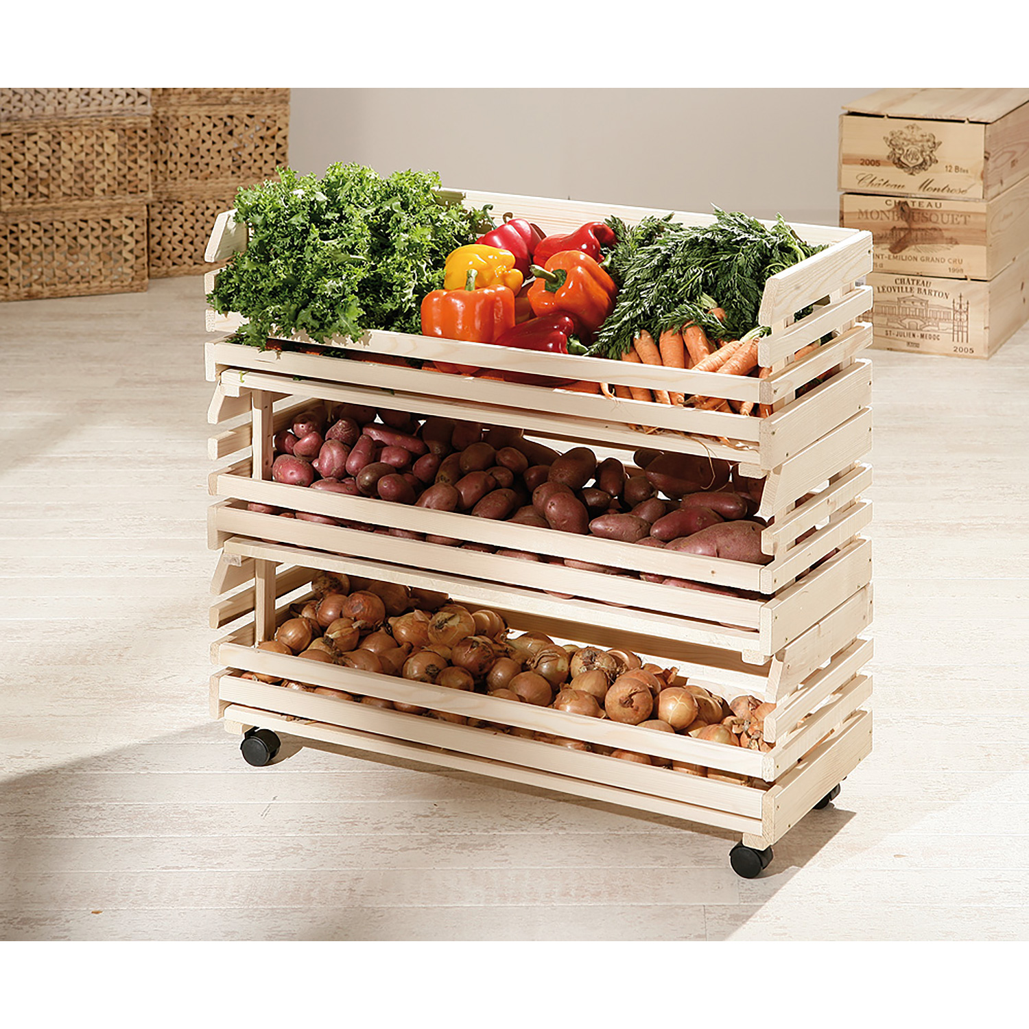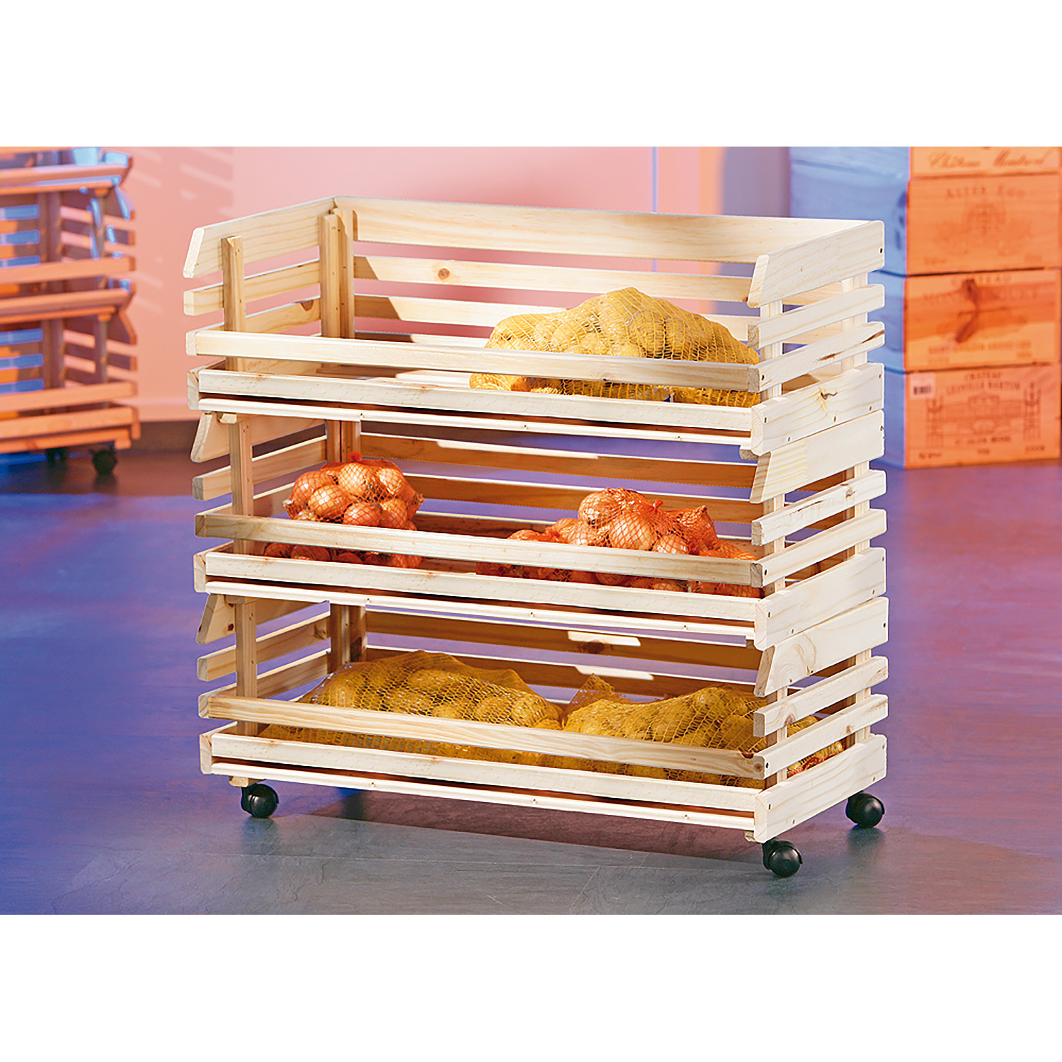 Potom by vo vašej domácnosti nemali chýbať skladacie regály. Skladací regál VEGETABLE je zložený z troch stohovateľných debničiek. Spodná debnička je vybavená kolieskami, takže aj plný regál ľahko presuniete do kuchyne, kde vám bude nápomocný pri varení. Do jednotlivých debničiek totiž môžete uložiť ako ovocie, tak zeleninu. Debničky vám tak budú stáť pekne po ruke pri varení a krájaní. Do jednotlivých debničiek môžete poskladať, zemiaky, cibuľu a cesnak, banány, pomaranče, jablká, uhorky, šaláty, paradajky aj tekvice. Záleží len a len na vás, čomu dávate na tanieri prednosť. Skladacie regály VEGETABLE v prevedení masív sú skvelou pomôckou pri skladovaní potravín. Drevené debničky sú priedušné, takže v nich ovocie a zelenina vydržia dlhšie svieže, skladujte ekologicky. Dopriať si vitamíny každý deň nie je teraz vďaka tomuto praktickému regálu nič nemožné. Skladací regál nezaberie toľko miesta ako iné nestohovateľné pomôcky na uloženie potravín a ľahko z neho potrebné ingrediencie vyberiete, z jednej strany sú na debničkách nižšie bočnice. Skladací regál VEGETABLE však nemusíte využívať iba na skladovanie ovocia a zeleniny, ale skvele vám tiež poslúži miesto botníku na uloženie topánok, či ako komoda v izbe vybavenej moderným paletovým nábytkom.