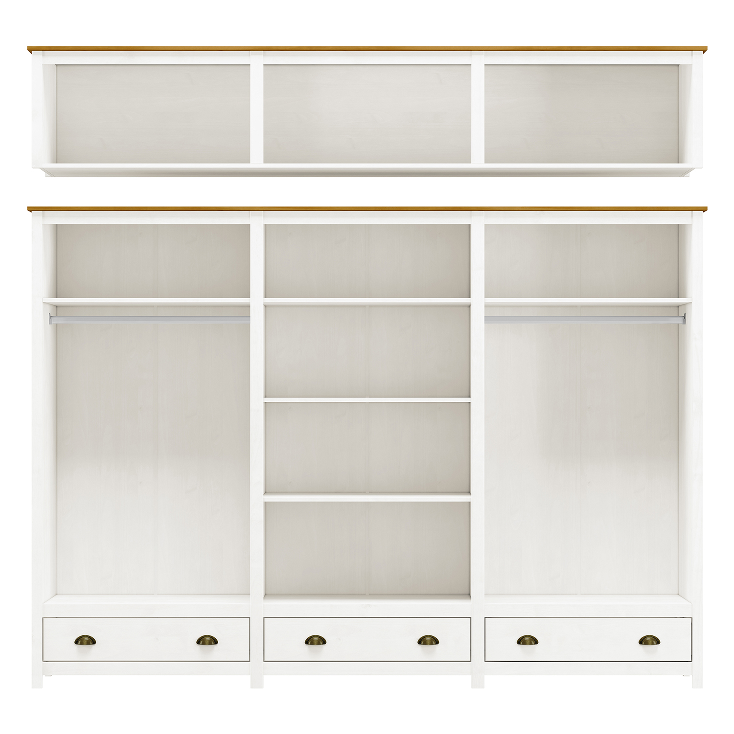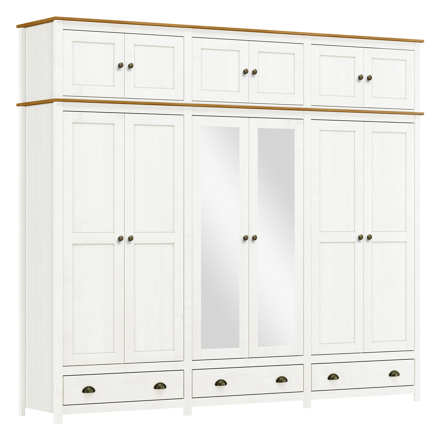 Skriňa s dvanástimi dverami zo série TOPAZIO je kus nábytku, ktorý si rozhodne nezaslúži stáť v kúte. Zaujme už na prvý pohľad svojou rozmernosťou a elegantnou kombináciou bielej a hnedej farby. Vdýchne priestoru vzdušnosť a zároveň vytvorí pocit domova. Táto skriňa je ideálna pre všetkých, ktorí chcú mať poriadok vo veciach a zároveň nechcú riešiť kompromisy medzi funkčnosťou a estetikou. Dvoje stredové dvere sú osadené zrkadlami, takže nielen že opticky zväčšia miestnosť, ale zároveň ponúknu každodenné pohodlie pri výbere oblečenia. Za nimi sa ukrývajú praktické police. Po stranách nájdete vždy jednu policu a šatníkovú tyč, ideálnu kombináciu pre kabáty, saká aj jemné blúzky. V spodnej časti sú tri zásuvky, ktoré zvládnu uschovať drobnosti aj sezónny textil. Skriňa má pevnú konštrukciu z masívnej borovice a vďaka lakovanej úprave pôsobí upravene a kvalitne. Nadstavec v hornej časti je súčasťou zostavy a elegantne uzatvára celý celok. Kovové úchytky dodávajú rustikálny charakter a ľahko sa uchopujú. Celkové rozmery skrine sú 261 × 54 × 232 cm, čo zaručuje dostatok úložného priestoru na každodenný život aj dlhodobé uskladnenie. Tento kus nábytku prináša prehľad, stabilitu a pokoj.