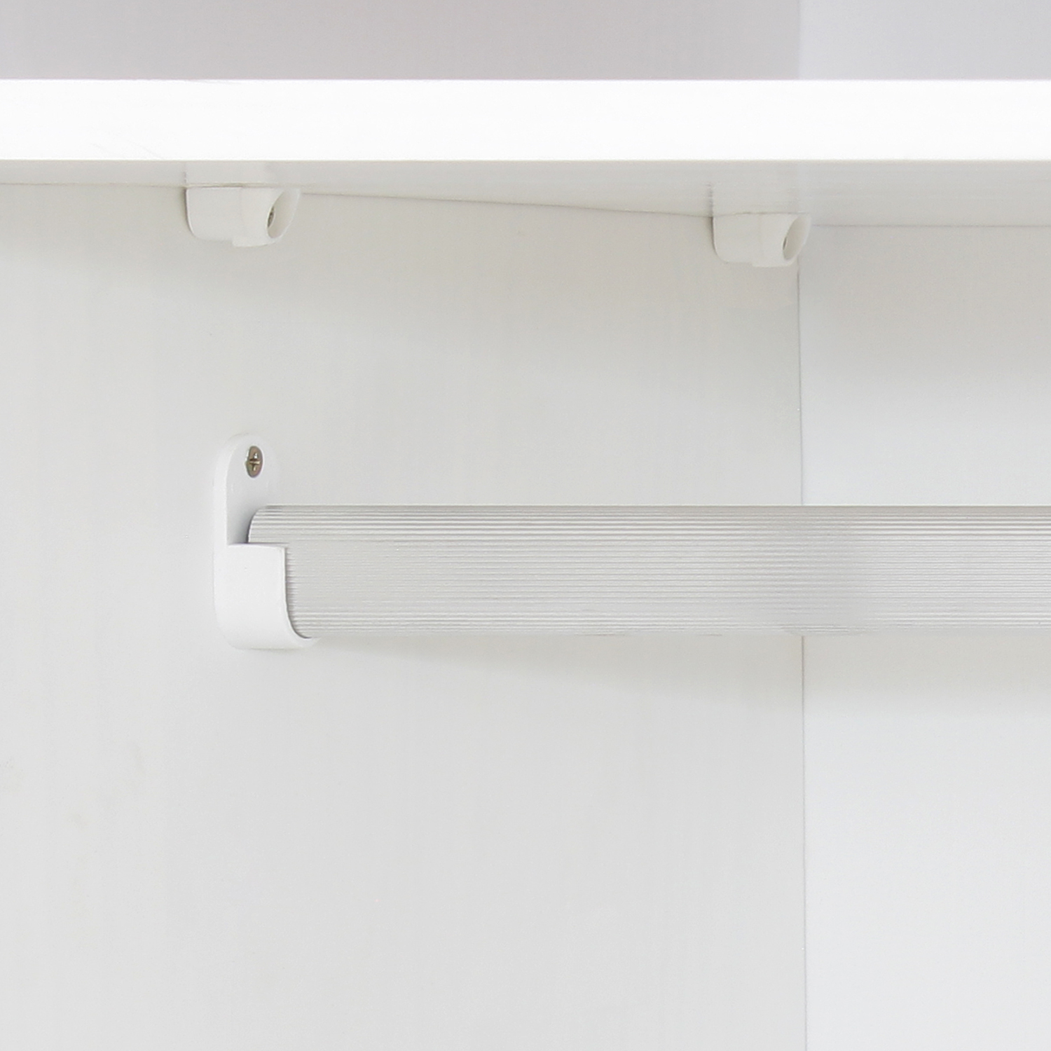 v ľavej a pravej časti 1 polica a kovová šatníková tyč, v strednej časti 3 police, na dvoch stredných dverách je zrkadlo