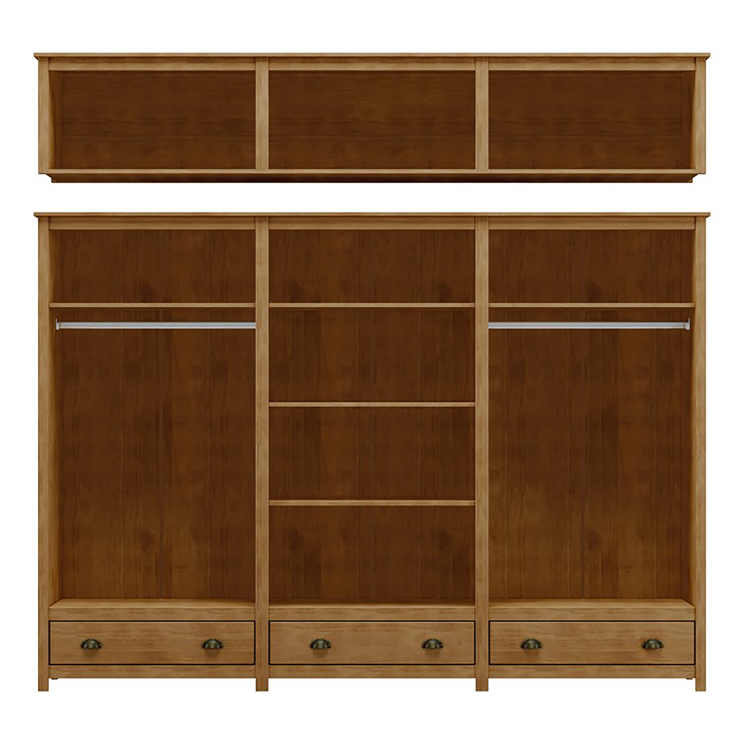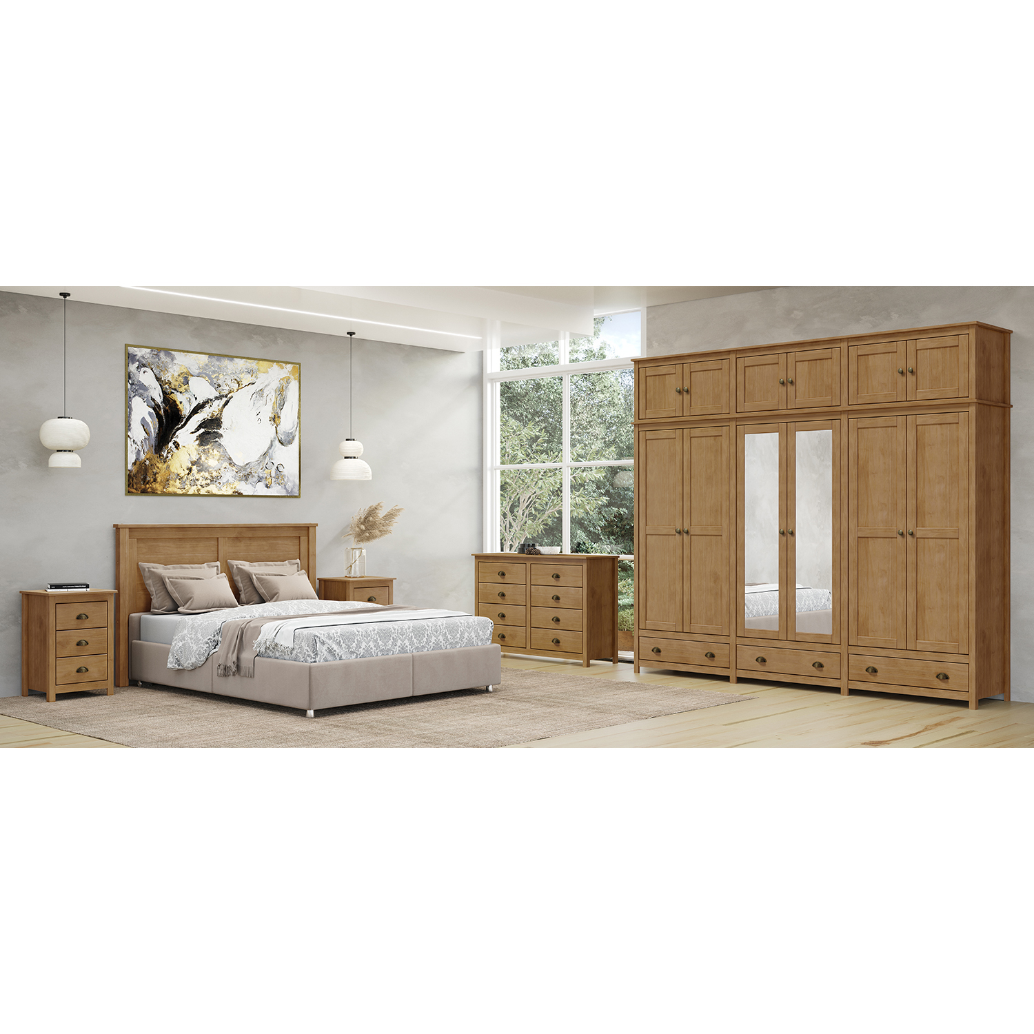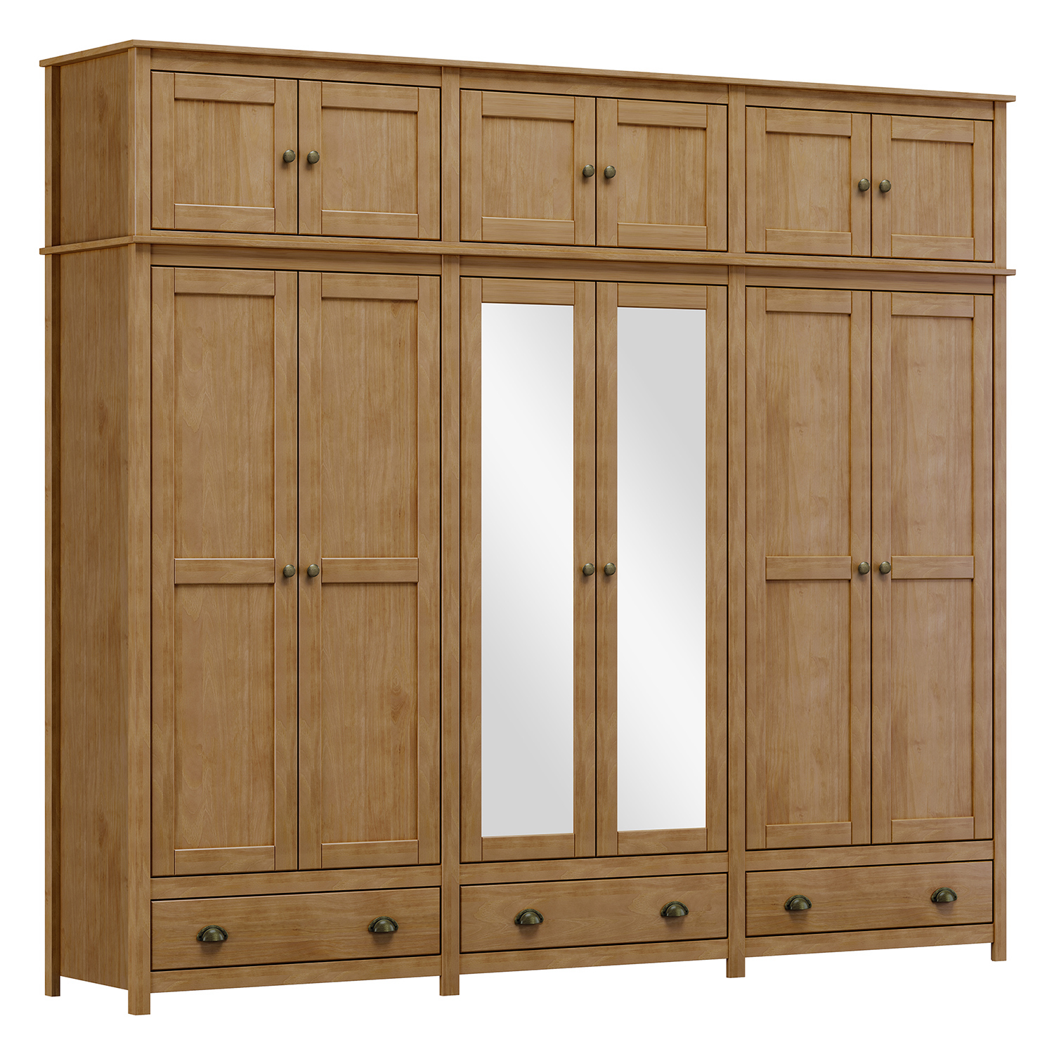Skriňa TOPAZIO v dekore dub je výrazným a zároveň praktickým kusom nábytku, ktorý prináša do interiéru pocit poriadku, priestoru a prirodzenej elegancie. Na prvý pohľad zaujme svojou impozantnou veľkosťou a premysleným členením, vďaka ktorému ponúka skutočne veľkorysý úložný priestor. Prirodzený vzhľad masívneho borovicového dreva vo farebnom tóne duba pôsobí teplo a nadčasovo, takže skriňa ľahko zapadne do klasicky aj moderne zariadených spální a vytvorí príjemnú atmosféru domova. Veľké množstvo dverí ukrýva prakticky rozdelený vnútorný priestor, ktorý umožňuje prehľadne uložiť oblečenie aj ďalšie textílie. Každá časť skrine je navrhnutá tak, aby poskytovala dostatok miesta pre rôzne typy odevov, od zavesených kabátov a košieľ až po zloženú bielizeň alebo sezónne doplnky. Vďaka tomu budete mať všetky veci usporiadané a ľahko dostupné bez zbytočného hľadania. Stredná časť skrine je doplnená zrkadlom, ktoré nielen uľahčuje každodenné obliekanie, ale zároveň opticky zväčšuje priestor a privádza do miestnosti viac svetla. Spodná časť skrine ponúka zásuvky vhodné na uloženie drobnejších vecí, ktoré potrebujete mať prehľadne oddelené. Celok tak pôsobí nielen priestranne, ale aj veľmi prakticky. Horný nadstavec umožňuje využiť priestor až k stropu a poskytuje ďalšie miesto na uloženie menej používaných vecí. Skriňa TOPAZIO v dekore dub tak predstavuje ideálne riešenie pre tých, ktorí hľadajú veľký, prehľadný a zároveň esteticky pôsobivý úložný priestor, ktorý bude slúžiť dlhé roky a stane sa prirodzenou súčasťou domova.