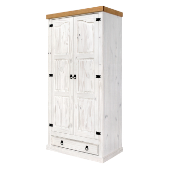 Pekne zariadená spálňa závisí nielen od dokonalého lôžka, ale aj skriňa by mala vyzerať naozaj dobre. Nevyberajte iba podľa jej praktickosti, ale voľte aj zaujímavý dizajn. Skriňa 2-dverová CORONA v prevedení masív borovica vás úplne očarí. Skriňa je voskovaná v krásnom medovom odtieni a je zdobená čiernymi kovovými pántami a úchytkami. Dvojdverová skriňa je nielen na prvý pohľad podareným kúskom nábytku, ale je aj prakticky vybavená. Skriňa obsahuje pevnú šatníkovú tyč a policu na doplnky, v spodnej časti sa nachádza veľká zásuvka, prehľadne tak usporiadate všetko oblečenie. Nábytok v rustikálnom štýle vyzerá dokonale ako v modernej domácnosti, tak na chalupe či chate. Zariaďte si nábytkom Corona celú domácnosť, uvidíte, že nebudete ľutovať, luxusne zariadený priestor zaujme všetkých prichádzajúcich.