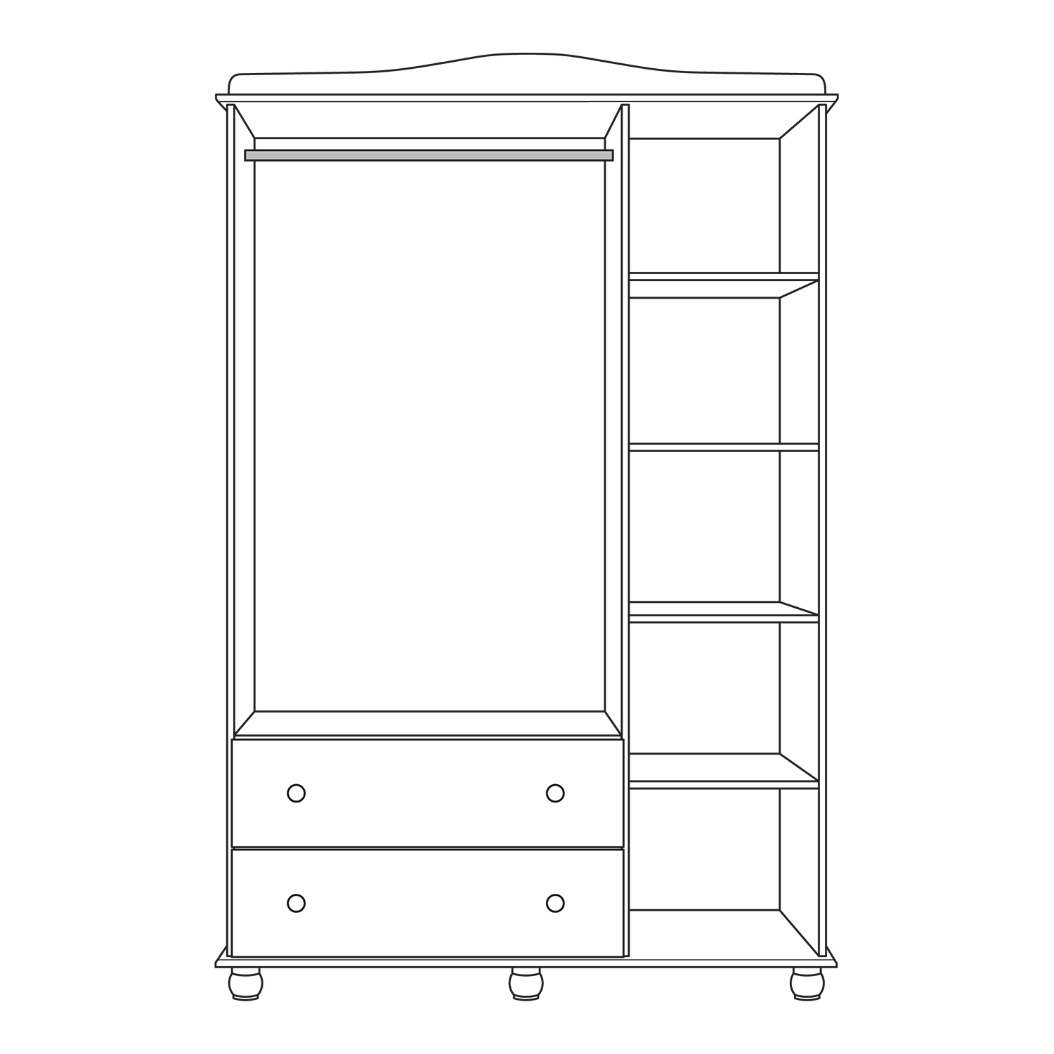 v ľavej časti dvere so zrkadlom, kovová šatníková tyč, 2 zásuvky s kovovými pojazdmi
