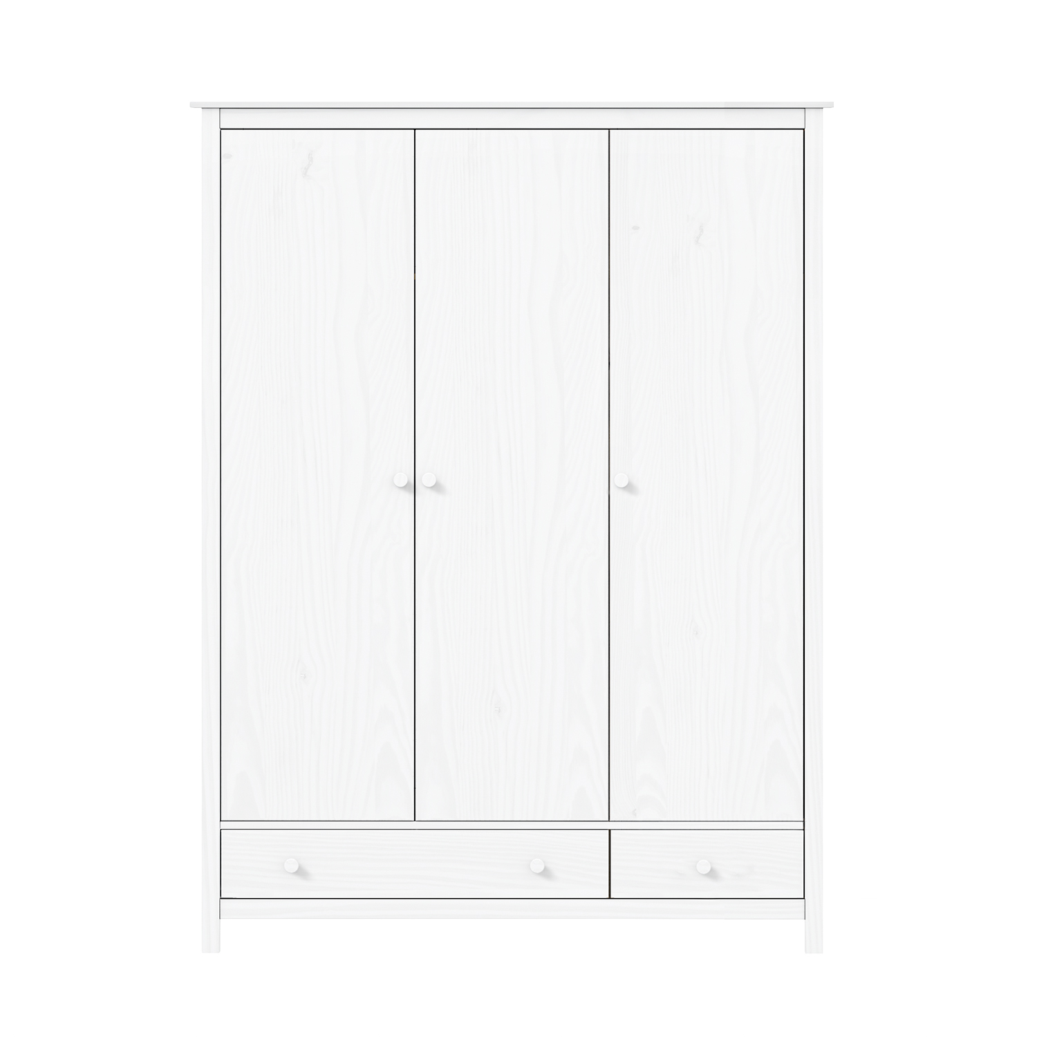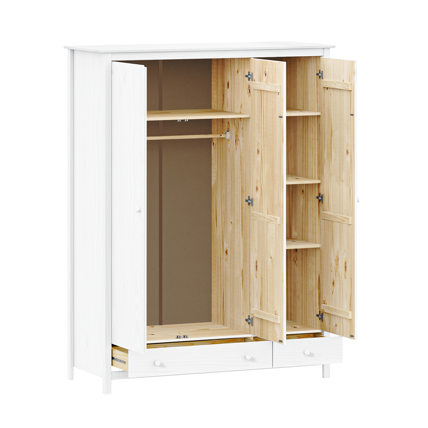 Skriňa 3-dverová TORINO v prevedení masív borovica v bielom laku je vhodná ako do vašej domácnosti, tak predovšetkým na chalupu či chatu zariadenú rustikálnym nábytkom TORINO biely lak. Skriňa 3-dverová TORINO je delená v pomere 2:1, v širšej časti sa nachádza pevná šatníková tyč a polica, v užšej časti potom nájdete tri police a v spodnej časti sa nachádzajú 2 zásuvky s kovovými pojazdmi. Skriňa tak bohato vystačí na zavesenie kabátov, odloženie doplnkov aj poskladanie oblečenia. Do masívnej skrine postavíte aj textilný box na uloženie spodnej bielizne. Masívny nábytok je vždy skvelou voľbou, či už s ním vybavíte domácnosť alebo zariaďuje chalupu. Rustikálny nábytok v bielom prevedení bude vyzerať dobre v akomkoľvek priestore, umiestnite krásnu skriňu napríklad aj do vašej spálne vedľa masívneho bieleho dvojlôžka TORINO.