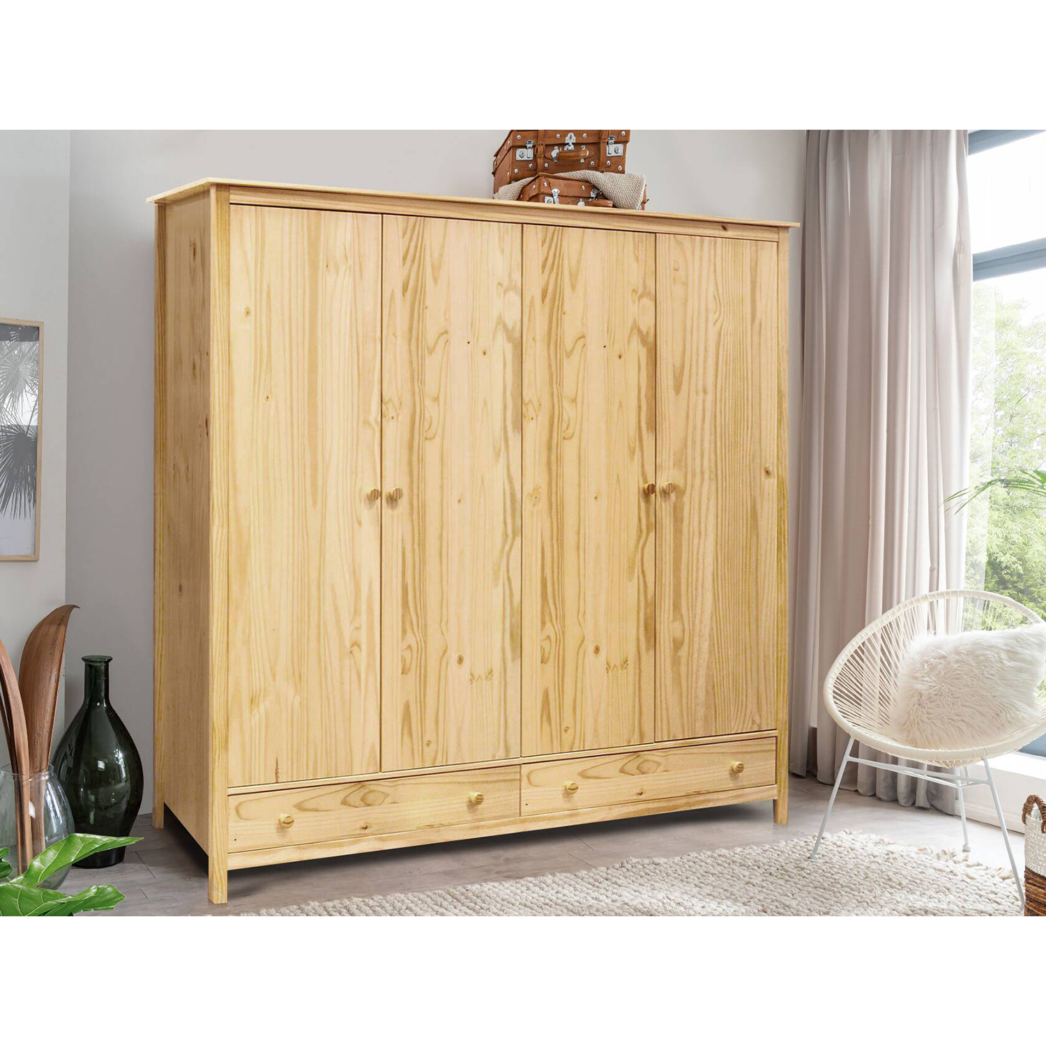 Krásna a priestranná skriňa je snom každého, kto disponuje viacerými kúskami oblečenia. Dostatok miesta na uloženie vašich zvrškov vám ponúkne skriňa 4-dverová TORINO. Je v klasickom prevedení masív borovica. Priestor je delený na polovice. V ľavej polovici je šatníková tyč a polica na klobúky. V pravej polovici sú 3 police. V spodnej časti sa nachádzajú 2 zásuvky s kovovými pojazdmi, kam môžete uložiť vaše doplnky alebo spodnú bielizeň. Do políc potom do komínov zvyšok oblečenia a na ramienka zavesíte bundy, šaty či košele. Vďaka jej vzhľadu vám bude skvele ladiť aj na chalupe či chate. Radosť však môže urobiť aj v moderne vybavenom dome.