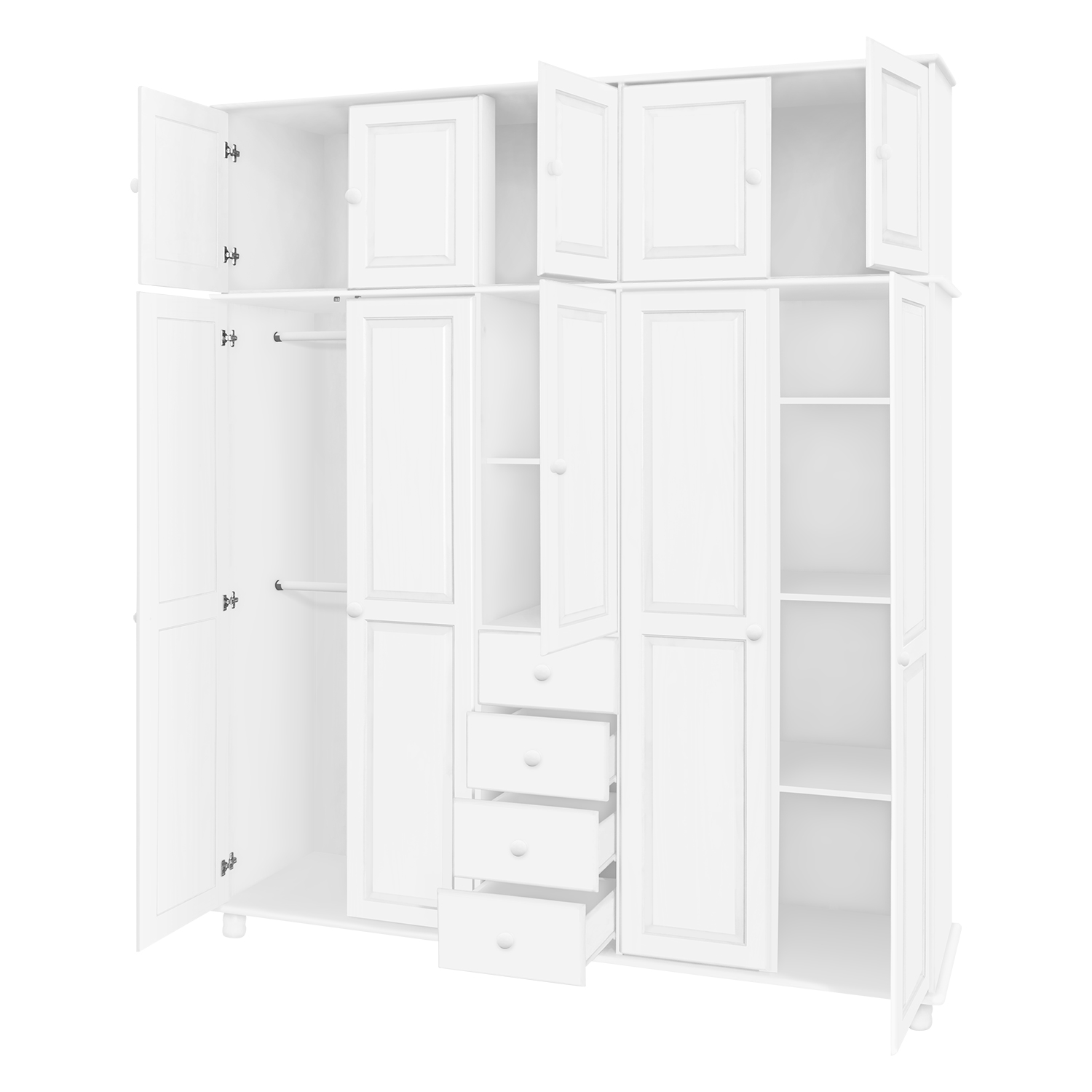 Máte naozaj obrovské množstvo oblečenia? Potom potrebujete aj obrovské množstvo úložného priestoru. Päťdverová skriňa 8854B, ktorú môžete ešte rozšíriť nadstavcom 8855B, je tak priestranná, že možno budete potrebovať ďalšie oblečenie. Masívne borovicové drevo nalakované bielym lakom, šatníkové tyče, množstvo políc a štyri zásuvky s kovovými pojazdmi, to sú len základné rysy skrine 8854B. Pre takto veľkú skriňu je ľahké vám niečo schovať. Nie je hanba vytvoriť si ku skrini orientačný plánik s popisom, kam ste čo dali. Keď budete niečo hľadať, plánik vám pomôže. Alebo len zoznam uložených vecí na vnútornej strane dverí? Ako si kto trúfne...